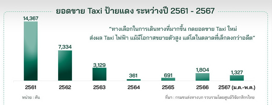 ศูนยฺวิจัยกสิกรไทยออกบทวิเคราะห์เกี่ยวกับตลาดรถแท็กซี่ไฟฟ้าล่าสุด แสดงให้เห็นถึงการเติบโตอย่างก้าวกระโดดของยอดจดทะเบียนรถแท็กซี่ไฟฟ้าในประเทศไทย โดย 5 เดือนแรกของปี 2567 (ม.ค.-พ.ค.) มียอดจดทะเบียนทั้งสิ้น 1,327 คัน คิดเป็น 62% ของยอดจดทะเบียนรถแท็กซี่ป้ายแดงรวม