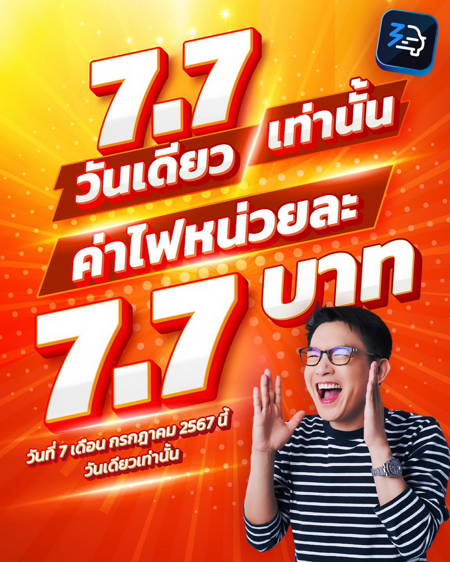 ไม่ใช่ลาซาด้า ไม่ใช่ชอปปี้ แต่ 7.7 นี้ Charge24 ใจดี คิดค่าชาร์จหน่วยละ 7.7 บาท ทุกช่องทาง ไม่ว่าจะชาร์จผ่าน Kiosk หรือ Application เริ่มไปแล้ว ถึงเวลา 23.59 วันที่ 7 เดือนกรกฎาคม 2567 เท่านั้น