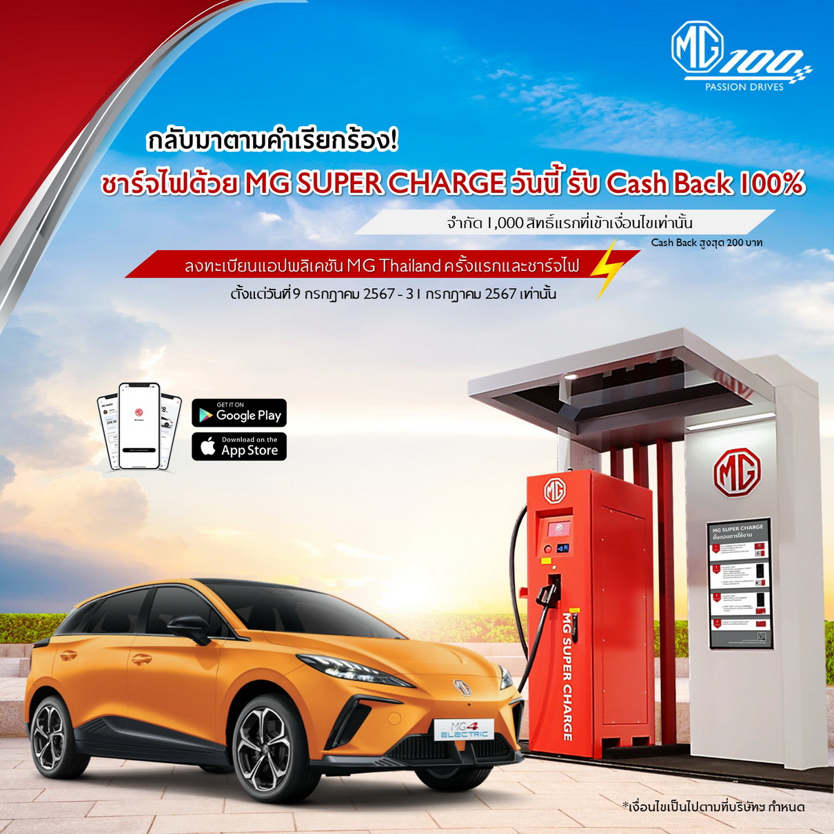 MG SUPER CHARGE จัดโปรโมชั่น Cash Back 100% (สูงสุดไม่เกิน 200 บาท) เมื่อชาร์จไฟที่สถานี MG SUPER CHARGE จำกัดเพียง 1,000 คนที่ลงทะเบียนผ่านแอปพลิเคชัน MG Thailand ครั้งแรก และชาร์จไฟระหว่างวันที่ 9 กรกฎาคม 2567 – 31 กรกฎาคม 2567