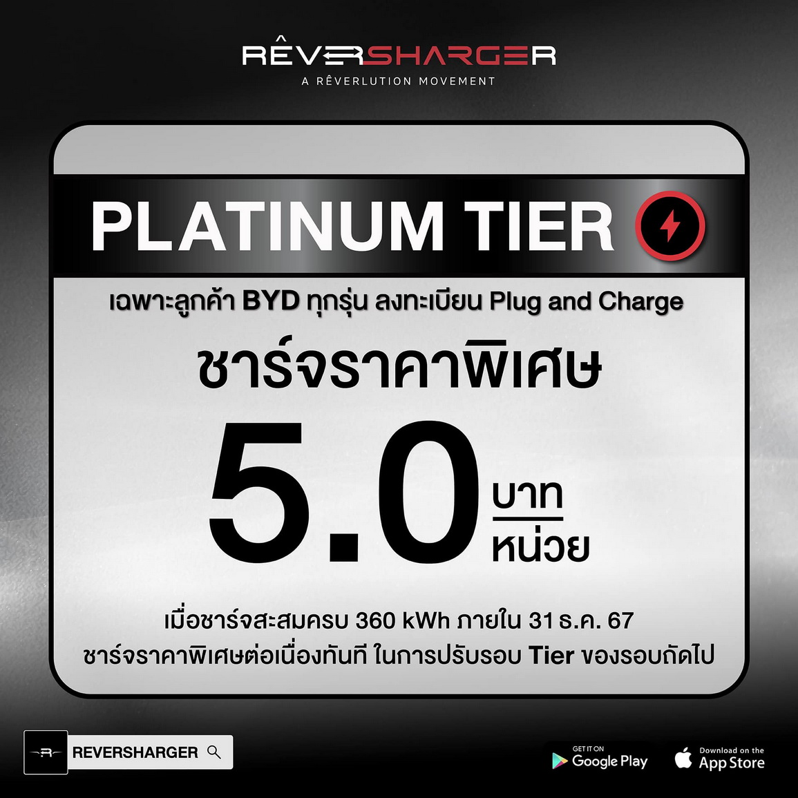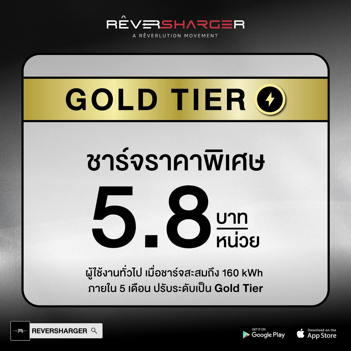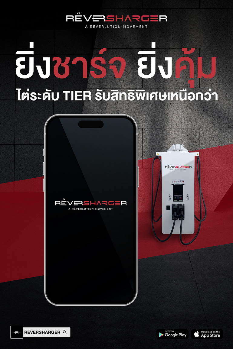 RÊVERSHARGER เปิดตัว Tier system ไล่เรียง 3 สเต็ปท์ SILVER TIER ค่าชาร์จ 7.2 บาท/หน่วย GOLD TIER ชาร์จสะสมถึง 160 kWh ภายใน 5 เดือน ลดค่าชาร์จเหลือ 5.8 บาท/หน่วย PLATINUM TIER สำหรับลูกค้า BYD ค่าชาร์จสตาร์ท 5.8 บาท/หน่วย ฯลฯ เริ่มต้นใช้งาน 1 สิงหาคม 2567 เป็นต้นไป