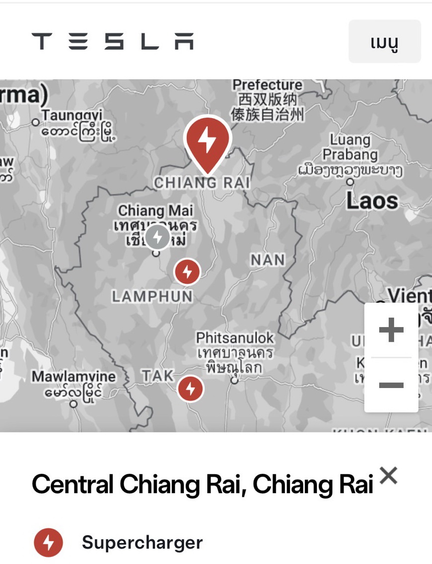 20.สถานี TESLA SUPERCHARGE เชียงราย พิกัดหน้าห้างเซ็นทรัล เชียงราย เลขที่ 99/9 ถ.พหลโยธิน จ.เชียงราย ติดตั้งเครื่องชาร์จ 4 Supercharger กำลังสูงสุด 250kW รองรับระบบชาร์จ CCS จำนวน 4 เครื่อง เปิดให้บริการทุกวัน ตลอด 24 ชั่วโมง
