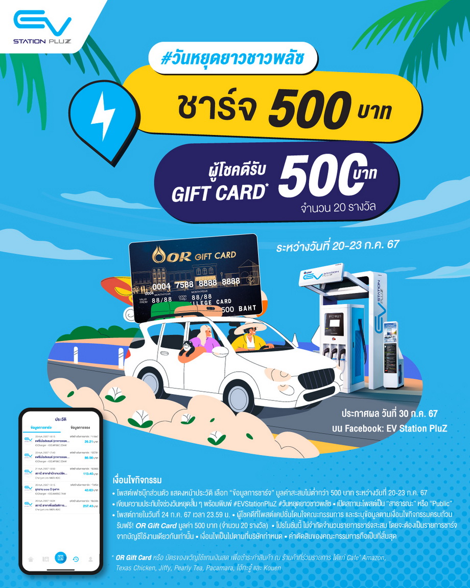 หยุดยาวเทศกาลเข้าพรรษาปีนี้ EV Station PluZ จัดโปรฯ ชาร์จ 500 บาท รับ OR Gift Card มูลค่า 500 บาท (จำนวน 20 รางวัล) ตั้งแต่วันที่ 20 ก.ค. - 24 ก.ค. 67 เวลา 23.59 น.