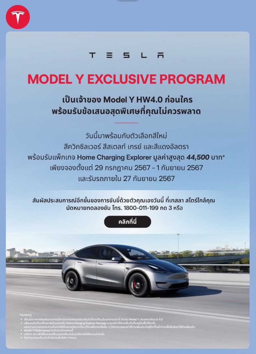 TESLA THAILAND จัดโปรแกรมพิเศษสำหรับ Model Y HW4.0 ด้วยข้อเสนอพิเศษที่มาพร้อมตัวเลือกสีใหม่ สีควิกซิลเวอร์ สีสเตลท์ เกรย์ และสีแดงอัลตรา เปิดจองตั้งแต่ 29 กรกฎาคม 2567 - 1 กันยายน 2567 และรับรถภายใน 27 กันยายน 2567 รับแพ็กเกจ Home Charging Explorer เครื่องชาร์จพร้อมติดตั้ง มูลค่าสูงสุด 44,500 บาท*