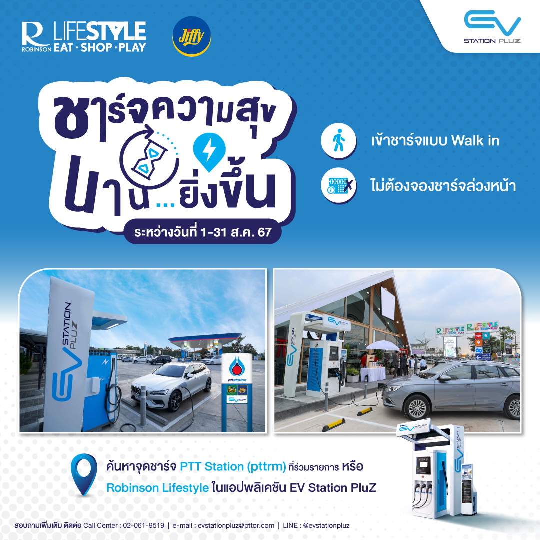 EV Station PluZ จัดโปรโมชั่น “Walk-in ได้เลย ไม่ต้องจองชาร์จล่วงหน้า” ที่ PTT Station (Pttrm) และ Robinson Lifestyle รวม 41 สาขา ตั้งแต่วันที่ 1 - 31 ส.ค. 67