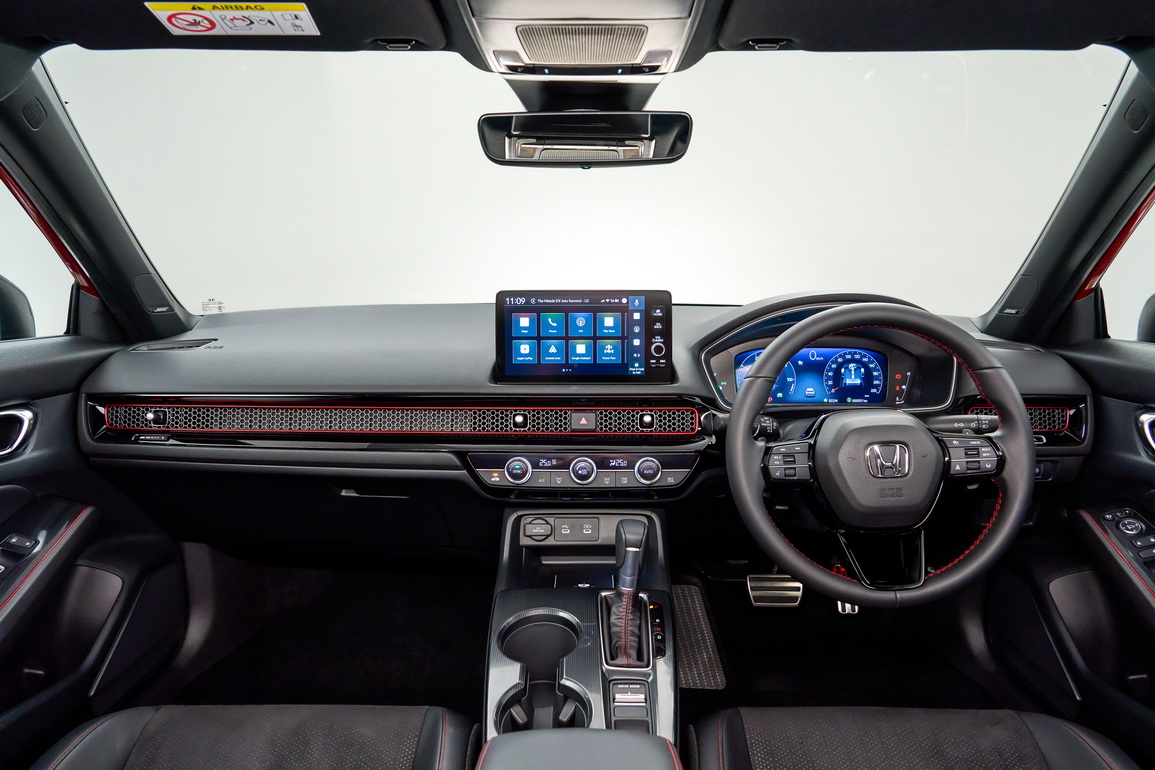 - รุ่น e:HEV RS มาพร้อมเบาะที่นั่งลายใหม่ Prime smooth ด้วยวัสดุเบาะหนังกลับและหนังสังเคราะห์สีดำตกแต่งด้วยด้ายสีแดง ตกแต่งแผงคอนโซลหน้าและแผงประตูด้านข้างสีแดงสไตล์สปอร์ต