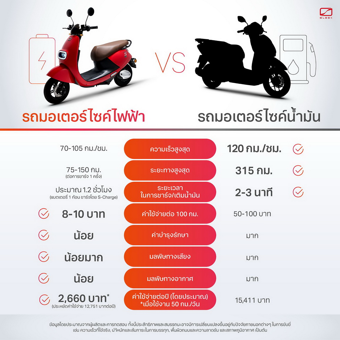 ใครที่กำลังลังเลหรือยังตัดสินใจไม่ได้ว่าจะซื้อรถมอเตอร์ไซค์ไฟฟ้าดีไหม? SLEEK EV เปรียบเทียบข้อมูลเบื้องต้นระหว่างรถมอเตอร์ไซค์ไฟฟ้า VS รถมอเตอร์ไซค์น้ำมันให้เห็นกันแบบชัดๆ ทั้งนี้ ประสิทธิภาพและสมรรถนะสามารถขึ้นอยู่กับปัจจัยภายนอก เช่น ความเร็วที่ใช้จริง , น้ำหนักบรรทุก , พื้นผิวถนน/ความชัน และสภาพภูมิอากาศ เป็นต้น