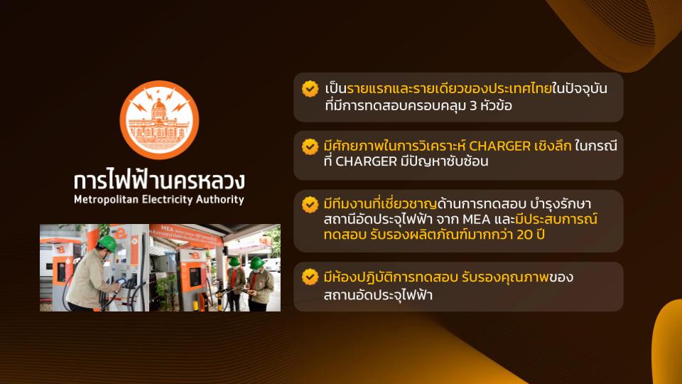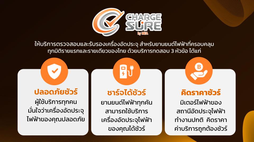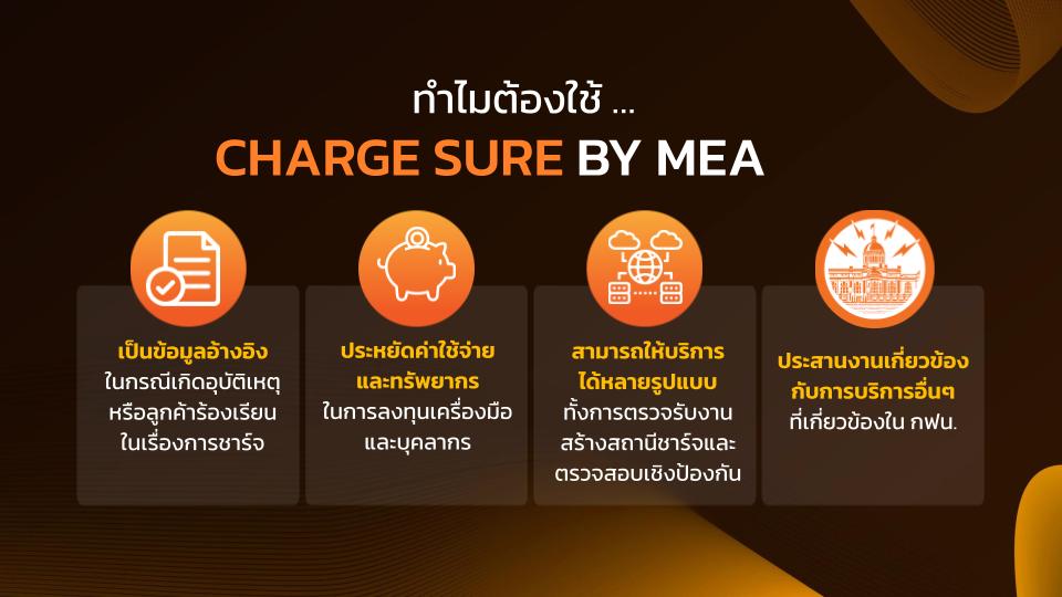 เทรนด์ EV ที่มาเร็ว แรง ในไทยทำให้แนวโน้มความต้องการในการใช้เครื่องอัดประจุไฟฟ้า การเกิดขึ้นของสถานีอัดประจุไฟฟ้า และบริการอื่น ๆ ที่เกี่ยวเนื่องกับยานยนต์ไฟฟ้า มีการขยายตัวอย่างรวดเร็ว การไฟฟ้านครหลวงในฐานะผู้ดูแลระบบจำหน่ายไฟฟ้าเล็งเห็นถึงความสำคัญในการให้บริการตรวจสอบและรับรองเครื่องอัดประจุไฟฟ้าสำหรับยานยนต์ไฟฟ้า  ให้มีความพร้อมใช้งาน มีความปลอดภัยต่อผู้ใช้งาน และความถูกต้องในการคิดค่าบริการ จึงได้ริเริ่มบริการภายใต้ชื่อ “Charge Sure by MEA” เพื่อให้ตรวจสอบและรับรองเครื่องอัดประจุไฟฟ้าทั้งภาครัฐและเอกชนทั่วประเทศ และยกระดับคุณภาพของผู้ใช้ยานยนต์ไฟฟ้า โดยวิศวกรผู้เชี่ยวชาญมากประสบการณ์