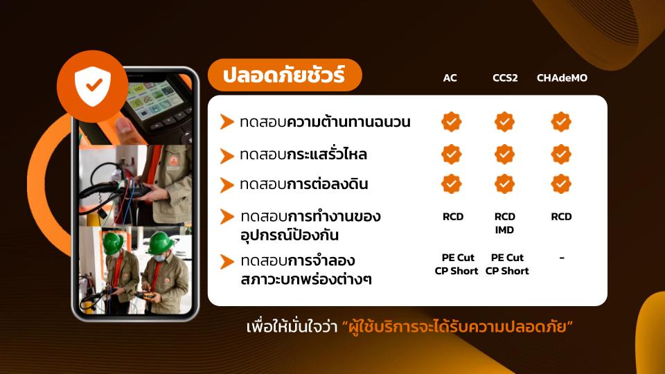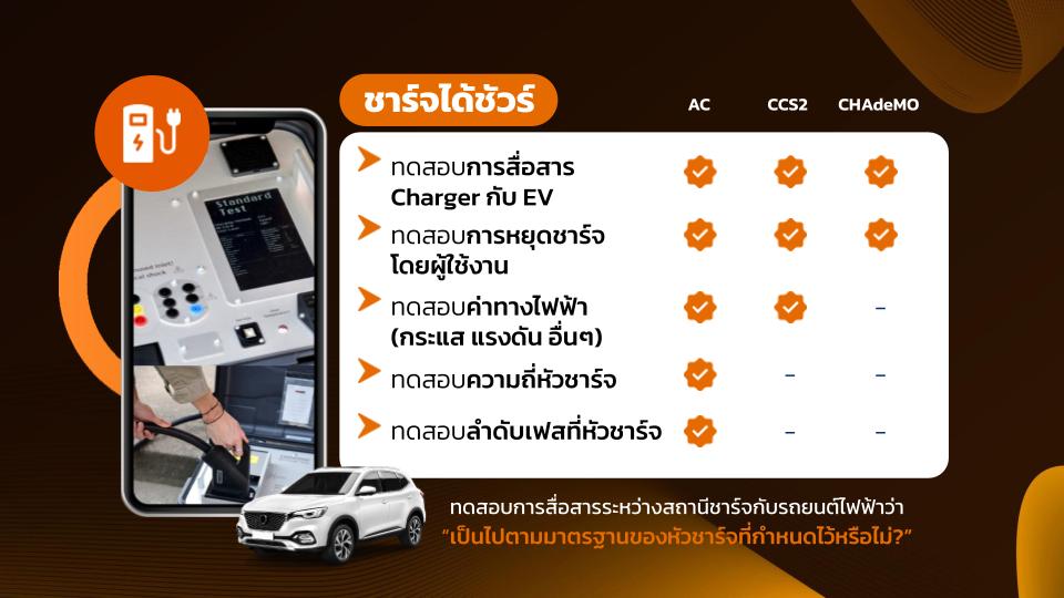 บริการตรวจสอบและรับรองเครื่องอัดประจุสำหรับรถยนต์ไฟฟ้าที่ครอบคลุมทุกมิติเป็นรายแรกและรายเดียวของไทย ด้วยบริการทดสอบ 3 หัวข้อ ได้แก่