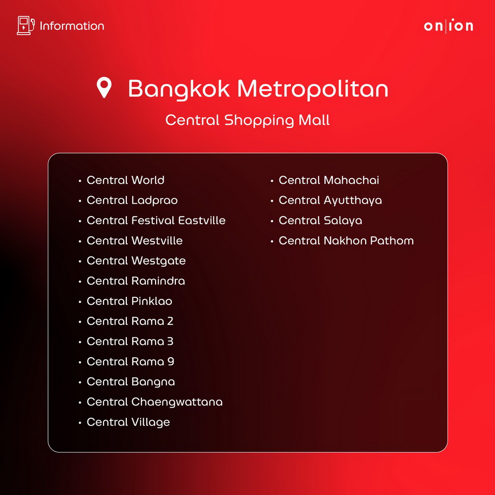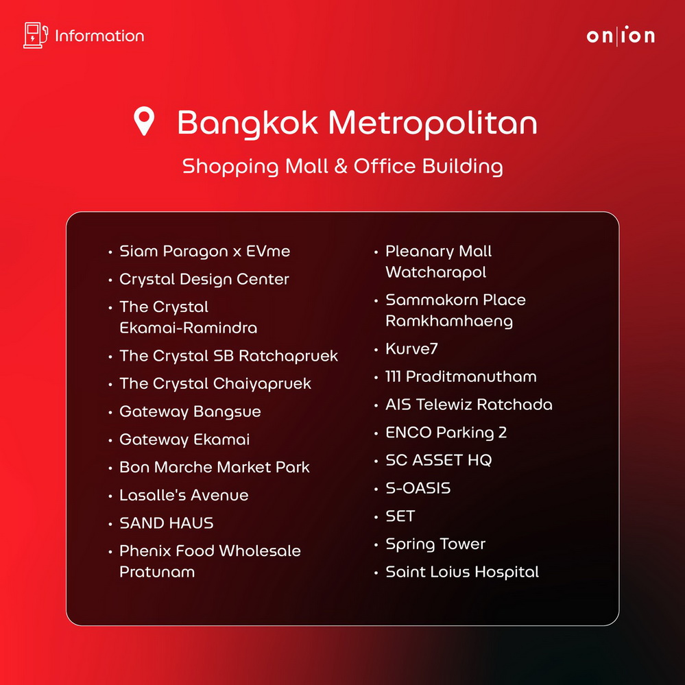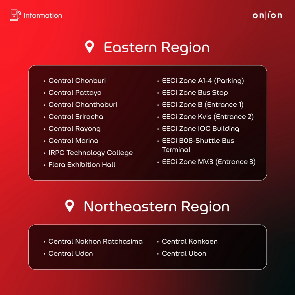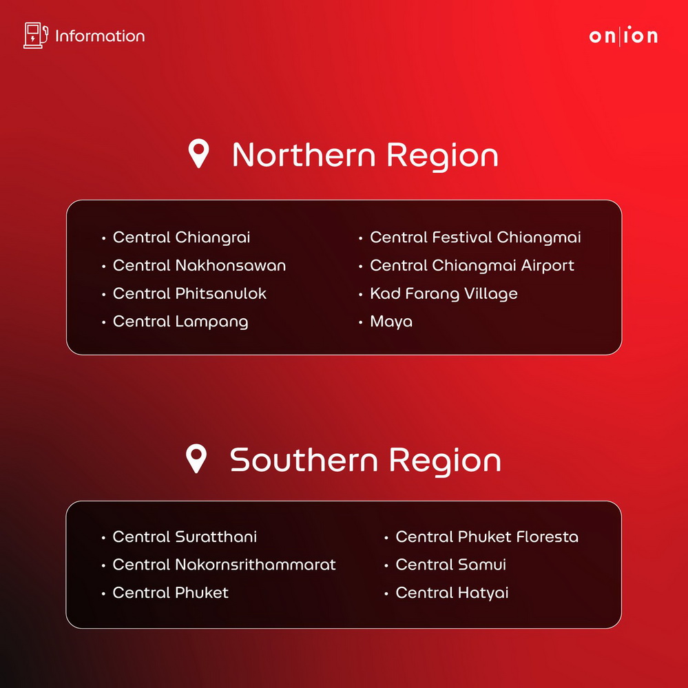 สถานีชาร์จ on-ion ภายใต้การดำเนินการของบริษัทอรุณ พลัส และมาตรฐาน ปตท. ให้บริการตามหัวเมืองทั่วประเทศ ตอบโจทย์ไลฟ์สไตล์คนรุ่นใหม่ เปิดให้บริการตามห้างสรรพสินค้าชั้นนํา อาคารสํานักงาน ฯลฯ สามารถดูรายละเอียดสถานีได้จาก Application และ Line Official