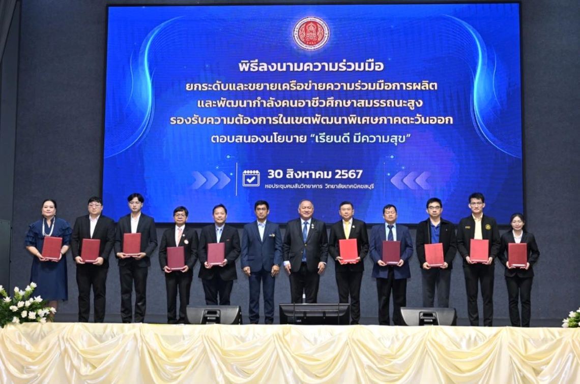 นายยศพล เวณุโกเศศ เลขาธิการ กอศ. กล่าวว่า สำนักงานคณะกรรมการการอาชีวศึกษา (สอศ.) ร่วมกับกัลยาณมิตรและภาคีเครือข่าย ภาครัฐและภาคเอกชน ทั้งในประเทศและต่างประเทศ ดำเนินความร่วมมือยกระดับและขยายเครือข่ายความร่วมมือการผลิตและพัฒนากำลังคนอาชีวศึกษาสมรรถนะสูง รองรับความต้องการในเขตพัฒนาพิเศษ ภาคตะวันออก ตอบสนองนโยบาย “เรียนดี มีความสุข” โดย พลตำรวจเอก เพิ่มพูน ชิดชอบ รัฐมนตรีว่าการกระทรวงศึกษาธิการ ได้มอบหมายให้ตนในฐานะเลขาธิการคณะกรรมการการอาชีวศึกษา เป็นประธานพิธีลงนามความร่วมมือจากนโยบายกระทรวงศึกษาธิการ มุ่งหวัง พัฒนาสถานศึกษาให้มีคุณภาพ มีมาตรฐาน ให้เกิดความเชื่อมั่นและศรัทธาจากผู้เรียนและผู้ปกครอง และให้สถานศึกษาดำเนินการตามนโยบาย "เรียนดี มีความสุข" โดยจัดสภาพแวดล้อมการเรียนให้เหมาะสม สนับสนุนการจัดการศึกษาทวิภาคี ส่งเสริมผู้เรียนอาชีวศึกษาได้รับทักษะ ที่ตรงกับความต้องการของภาคสถานประกอบการ ร่วมกันพัฒนาหลักสูตรต่างๆ เรียนรู้ด้วยการถ่ายทอดองค์ความรู้ และประสบการณ์ในการฝึกอาชีพ ตอบโจทย์ให้ผู้เรียนมีรายได้ระหว่างเรียน จบแล้วมีงานทำ หรือ Learn to Earn