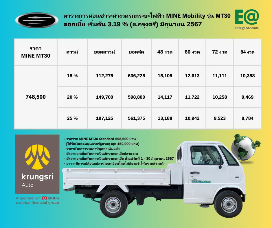 ตารางการผ่อนชำระรถกระบะไฟฟ้า MINE Mobility รุ่น MT30