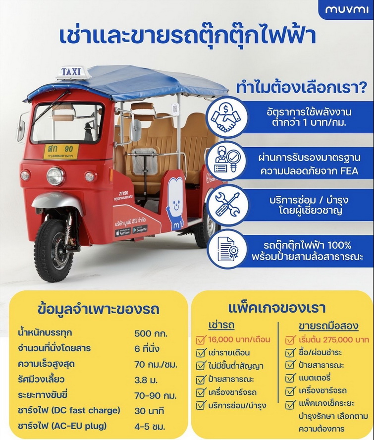 ปัจจุบันบริษัทฯ จดทะเบียนเป็นอันดับที่ 1 ของตลาดรถสามล้อไฟฟ้า มีการจดทะเบียนถูกต้องตามกฎหมายกับกรมการขนส่งทางบก รถสามล้อไฟฟ้ามูฟมีพร้อมป้ายสามล้อสาธารณะ สามารถวิ่งบนถนนได้ตามกฎหมาย นั่งได้สูงสุด 6 ที่นั่ง และมีการออกแบบที่คำนึงถึงความปลอดภัยของผู้โดยสารและผู้ขับขี่ ประหยัดพลังงานด้วยอัตราการสิ้นเปลืองไฟฟ้าต่ำเพียง 0.50 บาทต่อกิโลเมตร (อ้างอิงการคำนวณที่ค่าไฟฟ้า 5 บาทต่อหน่วย) สามารถเลือกรับรายงานสรุปปริมาณก๊าซเรือนกระจกที่ลดไปจากการใช้งานรถสามล้อไฟฟ้าในการเดินทาง พร้อมบริการซ่อมบำรุงถึงสถานที่ (on-site service) หรือเปลี่ยนรถคันใหม่ให้กรณีรถเสียไม่สามารถใช้งานได้ มีประกันภัยคุ้มครองตลอดการเช่าใช้งาน