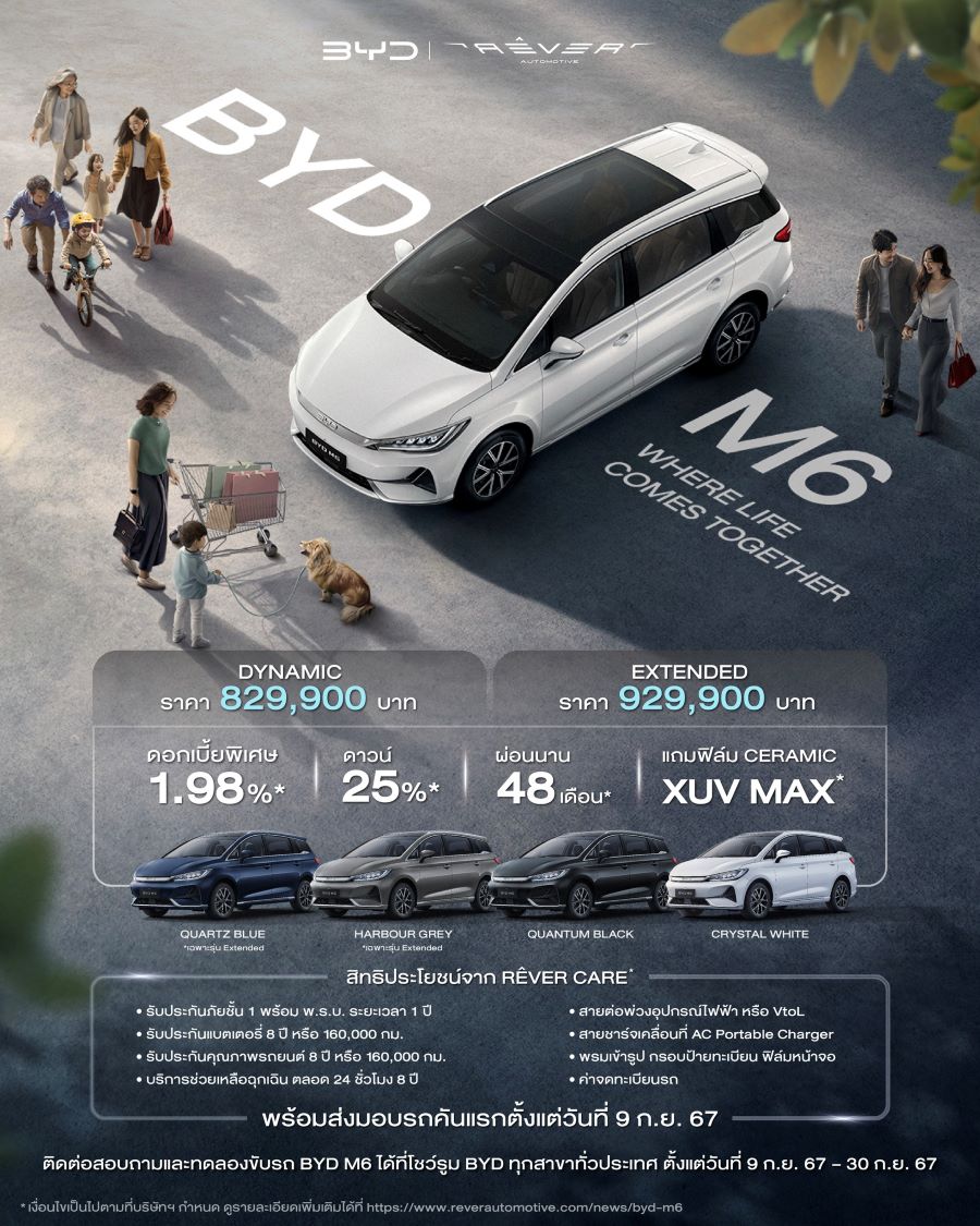BYD M6 รถยนต์ไฟฟ้า MPV 6 ที่นั่ง ตัวท็อปติดตั้งแบตเตอรี่ลิเธียมไอออนฟอสเฟต ความจุ 71.8 kWh แรงดันไฟฟ้า 400V มอเตอร์ 1 ตัว ติดตั้งที่เพลาหน้า กำลังสูงสุด 204 แรงม้า แรงบิดสูงสุด 310 นิวตันเมตร ความเร็วสูงสุด 160 กม./ชม. อัตราเร่ง 0-100 กม./ชม. ประมาณ 8 วินาที ระยะทางวิ่งสูงสุด 530 กม./ชาร์จ ราคาในประเทศจีนเริ่มต้นที่ประมาณ 150,000 หยวน เคาะราคารุ่นสแตนดดาร์ด 829,900 บาท ตัวท็อป 929,900 บาท