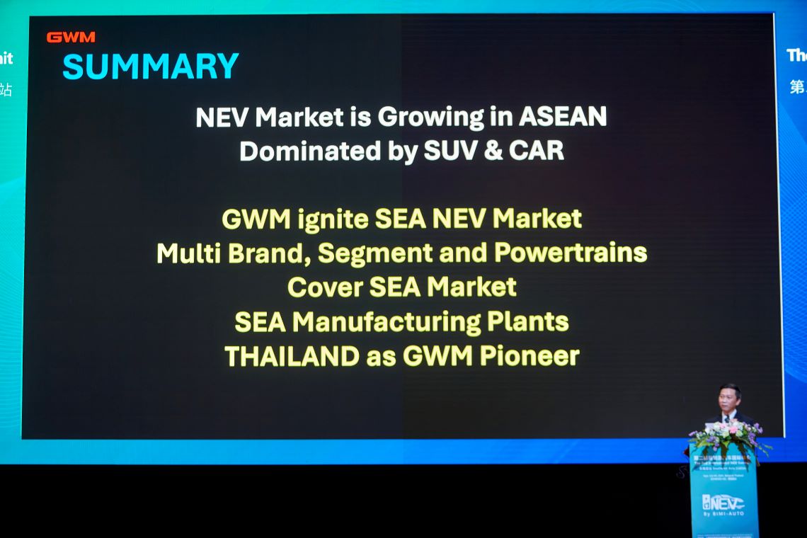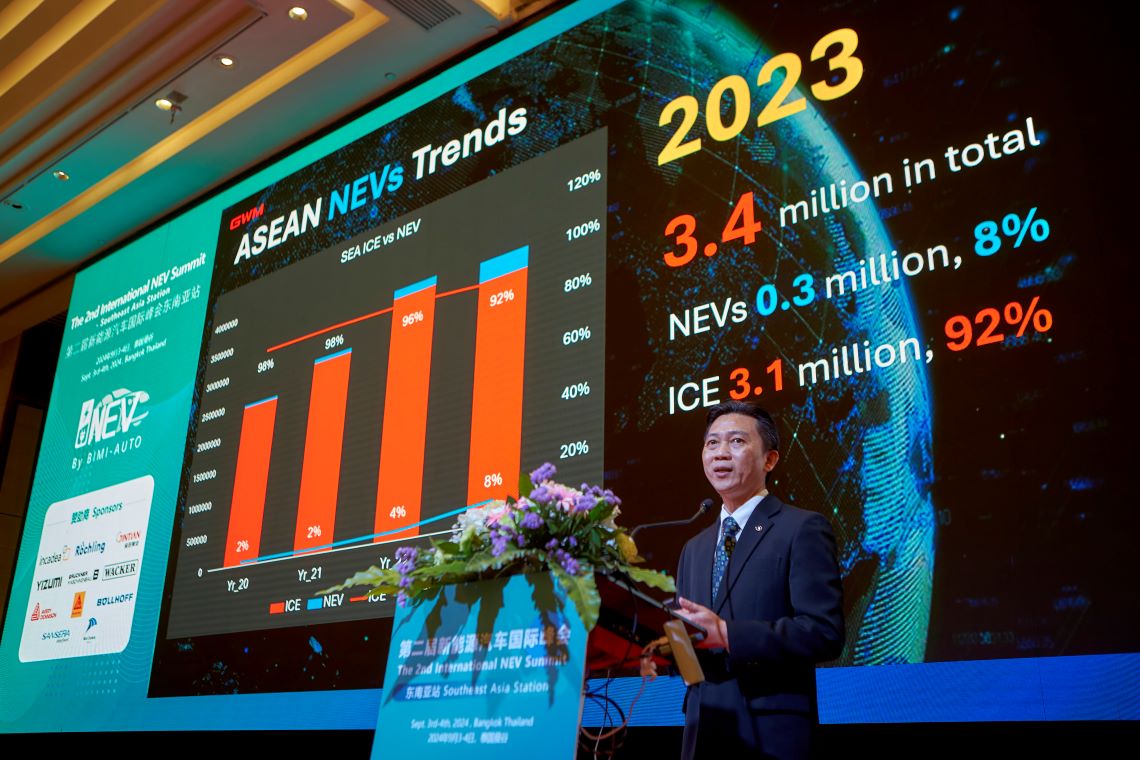 นายชาญศักดิ์ หลายเจริญโชคชัย ผู้อำนวยการฝ่ายวางแผนผลิตภัณฑ์ เกรท วอลล์ มอเตอร์ (ประเทศไทย) วิเคราะห์ข้อมูลตลาดรถยนต์พลังงานใหม่ทั้งในไทยและในภูมิภาคอาเซียนว่า “ภาพรวมอุตสาหกรรมรถยนต์ทั่วทั้งภูมิภาคอาเซียนในปี พ.ศ. 2566 มียอดขายทั้งสิ้น 3.4 ล้านคัน ในจำนวนนี้เป็นรถยนต์พลังงานใหม่ (NEV) กว่า 3 แสนคัน หรือ 8% ของตลาดรถยนต์โดยรวมทั้งหมด โดยใน 8% นี้ แบ่งเป็น รถยนต์ไฮบริด (HEV) 4%, รถยนต์ปลั๊กอิน-ไฮบริด (PHEV) 1%, และรถยนต์ไฟฟ้าประเภทแบตเตอรี่ (BEV) 3% ประเทศไทยมียอดขายรถ NEV สูงที่สุดในตลาดอาเซียน หรือประมาณ 64% ตามมาด้วยอินโดนีเซีย 19%, มาเลเซีย 8%, เวียดนาม 6% และฟิลิปปินส์ 3%