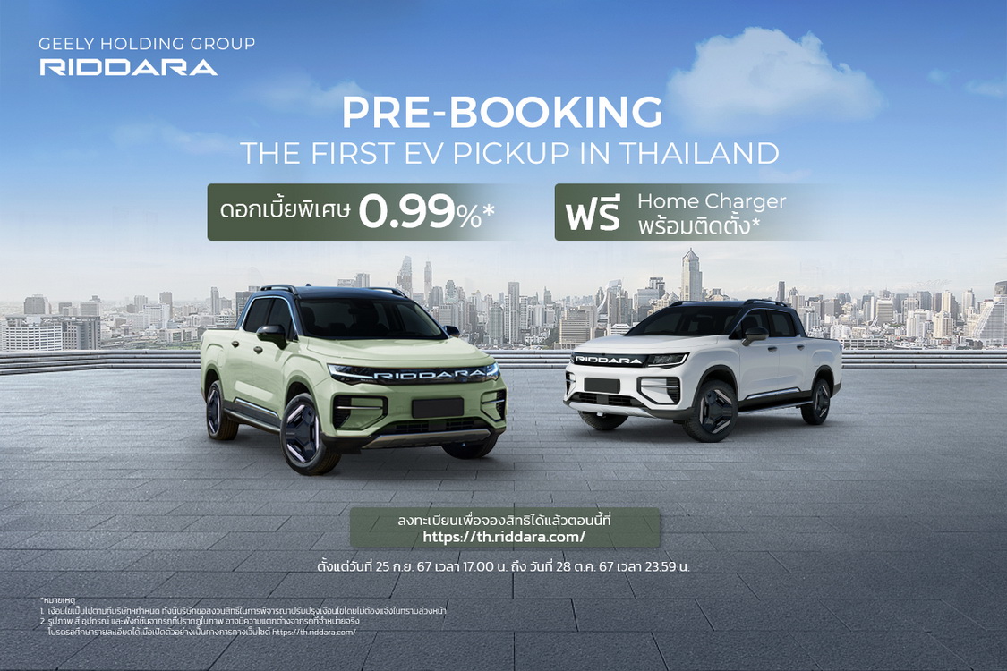 RIDDARA ประเทศไทย เปิด PRE-BOOKING รถกระบะไฟฟ้า 100% แบรนด์ RIDDARA จัดโปรฯดอกเบี้ยพิเศษ 0.99%นาน 48 เดือน เมื่อดาวน์ 25% พร้อม Home Charger จองสิทธิ์ได้ตั้งแต่ 25 ก.ย. 2567 ถึง 28 ต.ค. 2567 ผ่านเว็บไซต์ th.riddara.com จำกัดแค่ 1,000 คัน เตรียมเปิดตัวในงาน Motor Expo 2024 ปลายปีนี้