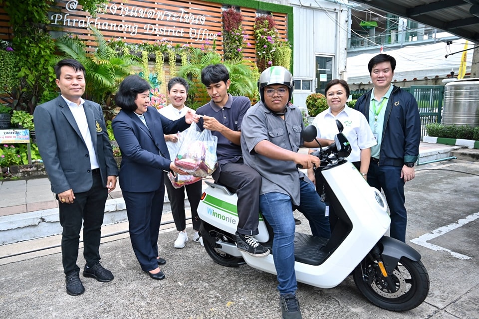 นางกลอยตา ณ ถลาง รองกรรมการผู้จัดการใหญ่ งานบริหารความยั่งยืนและสื่อสารองค์กร บริษัท บางจาก คอร์ปอเรชั่น จำกัด (มหาชน) ส่งมอบรถจักรยานยนต์ไฟฟ้าวินโนหนี้ แก่นางสายทิพย์ สุคนธ์มณี ผู้อำนวยการเขตพระโขนง เพื่อใช้ปฏิบัติภารกิจในโครงการ BKK Food Bank ของสำนักงานเขตฯ ส่งมอบอาหารส่วนเกินให้แก่ประชากรกลุ่มเปราะบาง โดยเฉพาะผู้สูงอายุและผู้ป่วยติดเตียงภายในพื้นที่เขตพระโขนงที่ไม่สามารถเดินทางมารับได้ด้วยตนเอง