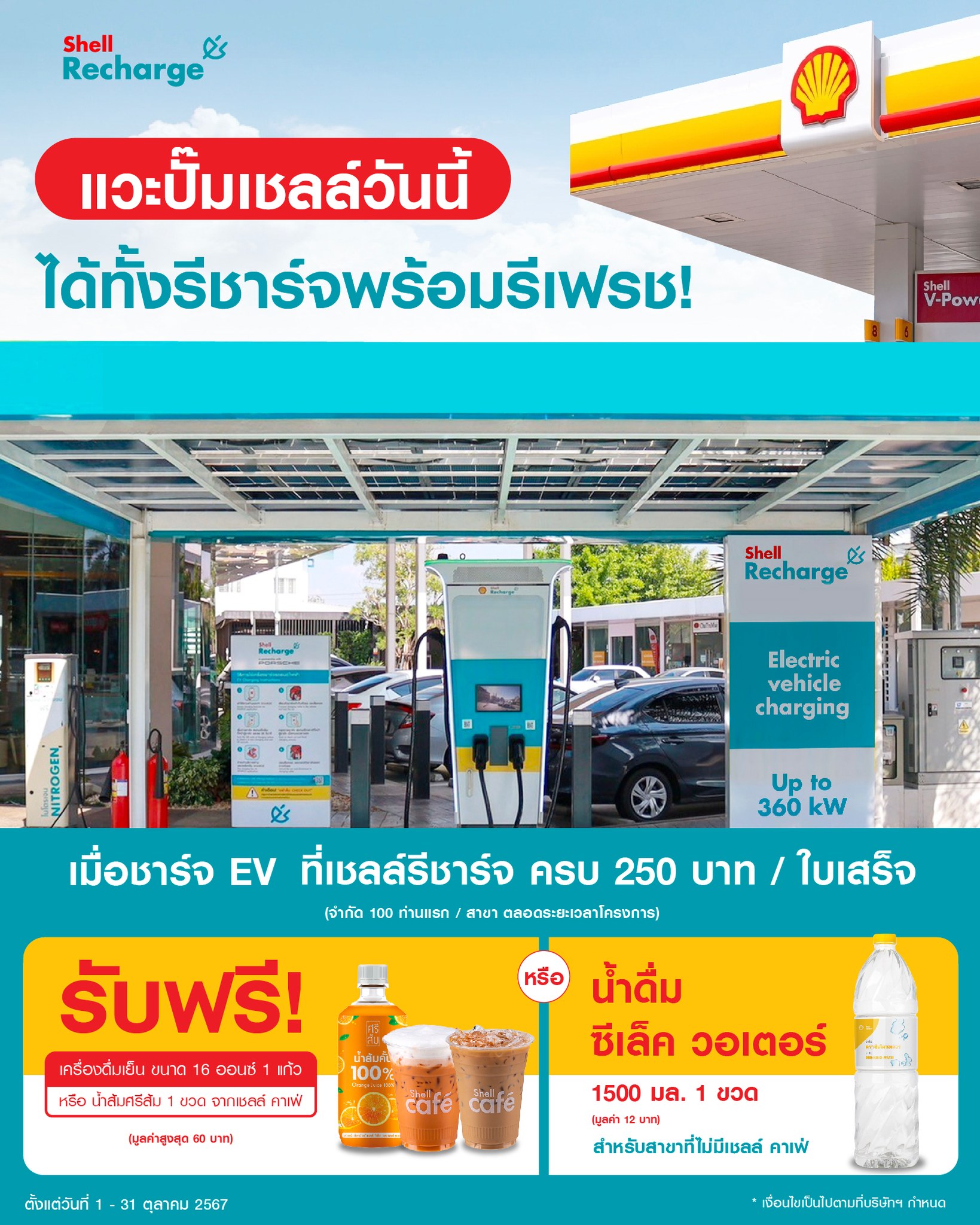Shell Recharge จัดโปรฯแจกเครื่องดื่มเย็น ขนาด 16 ออนซ์ หรือน้ำส้มศรีส้ม 1 ขวด จากเชลล์ คาเฟ่ (มูลค่าสูงสุด 60 บาท) เมื่อชาร์จรถ EV ที่เชลล์ รีชาร์จ ครบ 250 บาท/ใบเสร็จ (จำกัด 100 ท่านแรก/สาขา ตลอดระยะเวลาโครงการ) ตั้งแต่ 1 - 31 ตุลาคม 2567