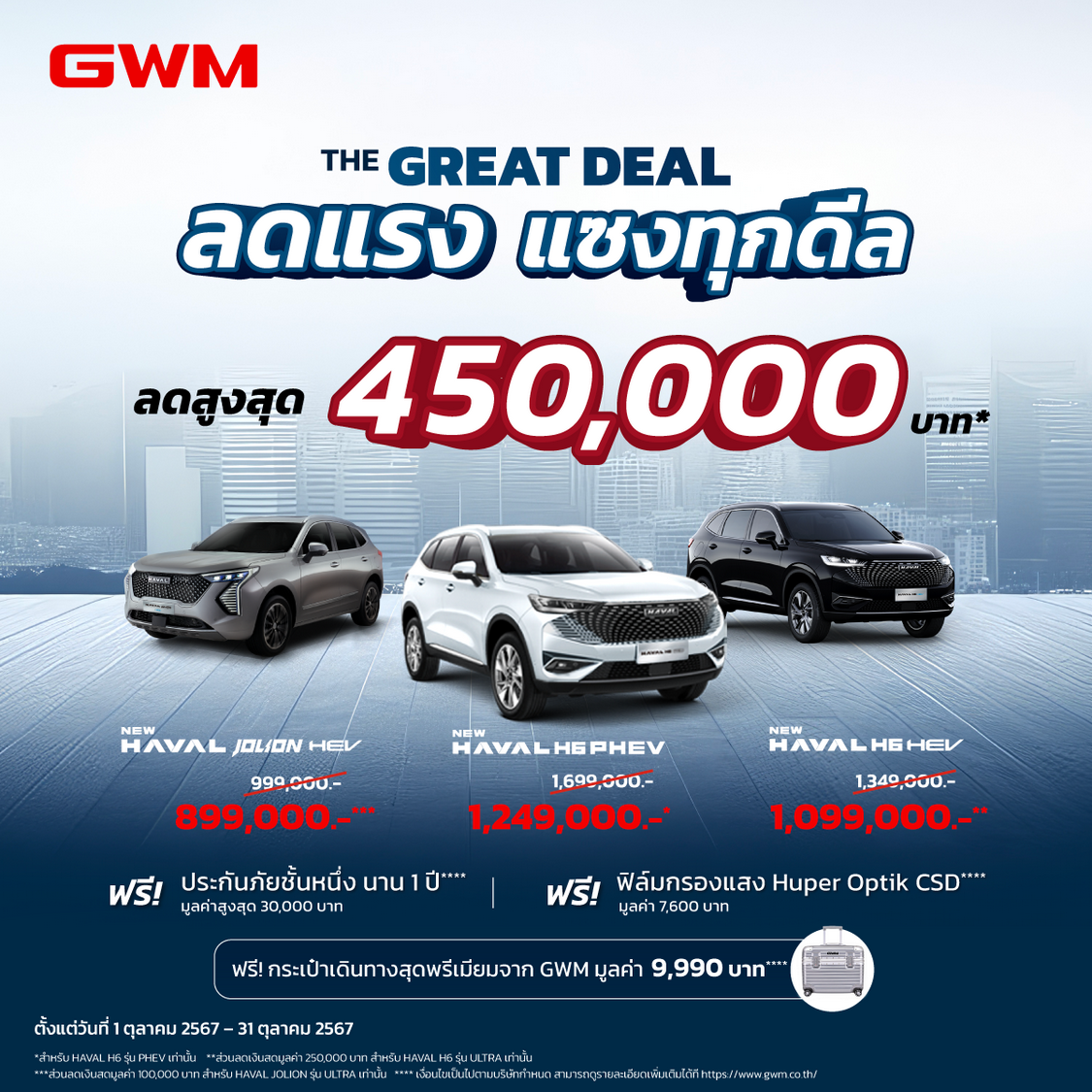 - All New GWM HAVAL H6 Plug-in Hybrid SUV จากราคา 1,699,000 บาท เหลือเพียง 1,249,000 บาท (ส่วนลด 450,000 บาท)