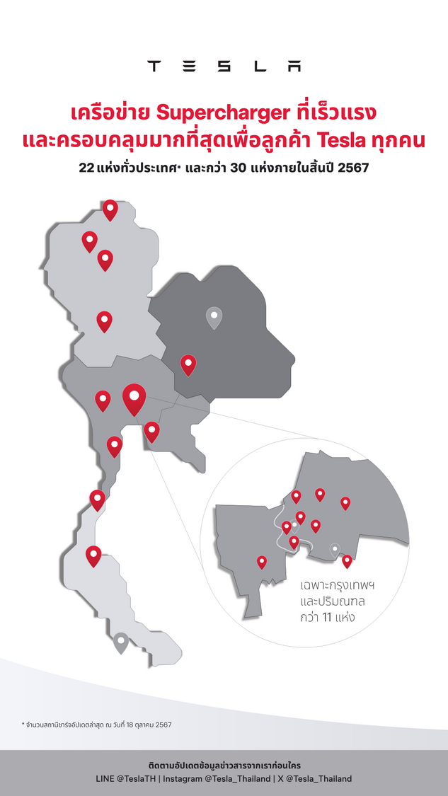 พิกัดสถานี Tesla Supercharging ที่เปิดให้บริการแล้วในประเทศไทย 22 จุด