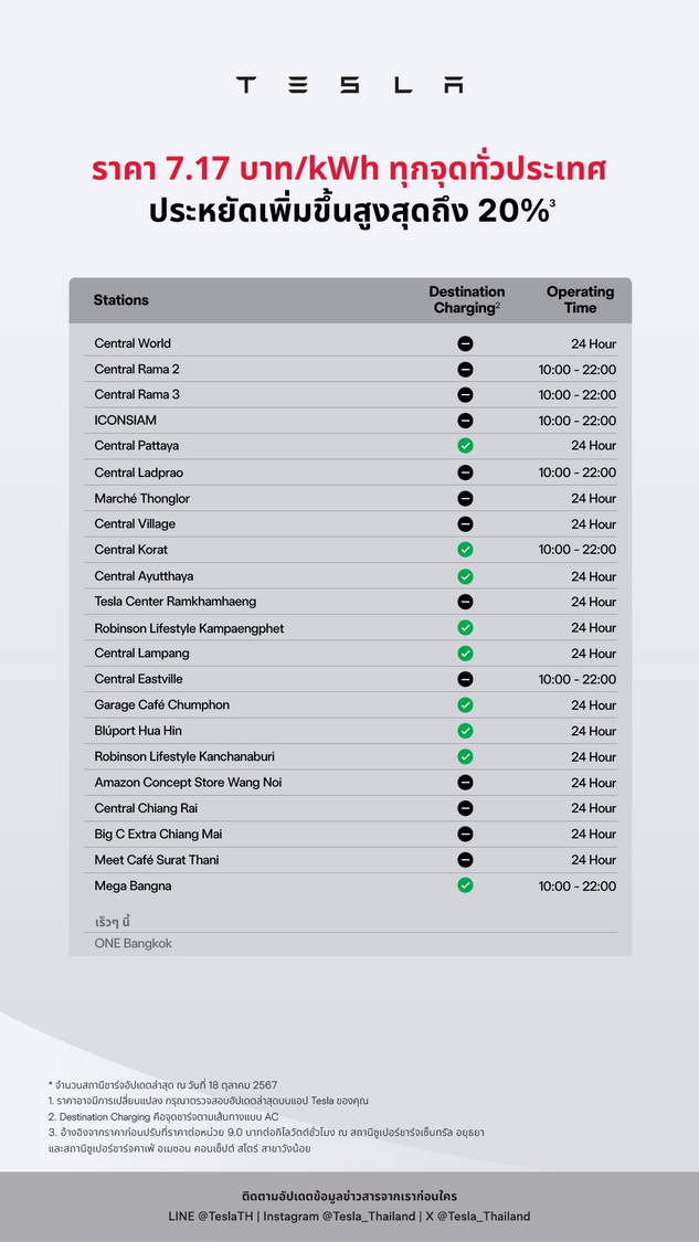 Tesla Thailand ประกาศปรับค่าชาร์จของสถานี Tesla SUPERCHARGE ทั้ง 22 แห่งทั่วประเทศ เป็น 7.17 บาท/kWh ลดลงสูงสุด 20% ตั้งแต่ 18 ตุลาคม 2567 เป็นต้นไป ตั้งเป้าขยายสถานีซูเปอร์ชาร์จครบ 30 แห่งภายในสิ้นปีนี้