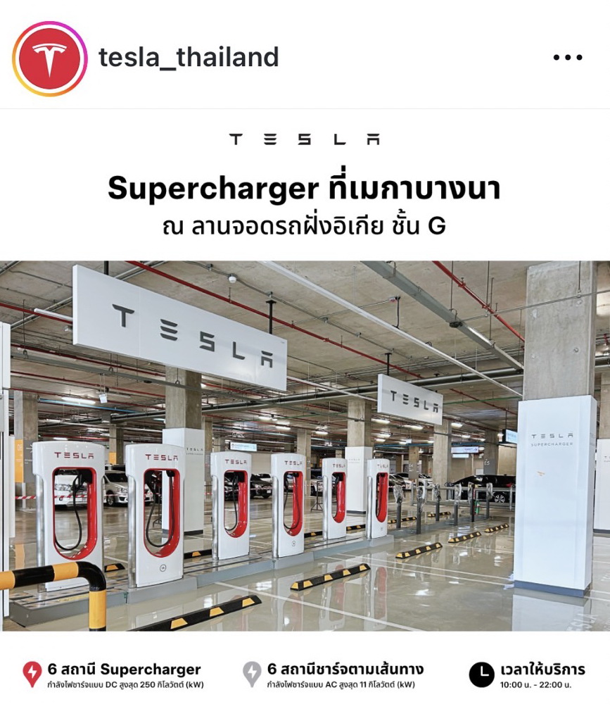 Tesla Supercharger แห่งใหม่ล่าสุดในไทย เปิดแล้ว ที่ เมกาบางนา พิกัด : อาคารจอดรถอิเกีย ชั้น G จัดเต็มเครื่องชาร์จแบบ DC ชาร์จเร็ว/แรงสูงสุด 250 กิโลวัตต์ (kW) จำนวน 6 เครื่อง 6 ช่องจอด
