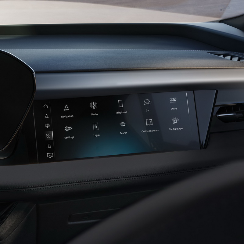 ภายในห้องโดยสารติดตั้งจอแสดงผลแบบพาโนรามิก Digital Stage ใหม่ของ Audi ซึ่งประกอบไปด้วยแผงหน้าปัดดิจิทัลขนาด 11.9 นิ้วและหน้าจอสัมผัสอินโฟเทนเมนต์กลางขนาด 14.5 นิ้ว (ควบคุมโดยระบบ MIB4 ที่ใช้ระบบปฏิบัติการ Android) แผงหน้าปัดได้รับการออกแบบให้เลียนแบบรูปร่างของกระจังหน้าแบบ Singleframe ของ Audi นอกจากนี้ยังมีตัวเลือกจอแสดงผลอินโฟเทนเมนต์ขนาด 10.9 นิ้วสำหรับผู้โดยสารตอนหน้าพร้อมโหมด Active Privacy เพื่อขจัดสิ่งรบกวนสมาธิของผู้ขับขี่ จอแสดงผลแบบ Head Up Display ที่ใช้ระบบ Argumented Reality และ Audi Assistant ที่ใช้ระบบ AI รวมถึงแถบไฟ LED แบบไดนามิกที่ล้อมรอบกระจกหน้ารถ