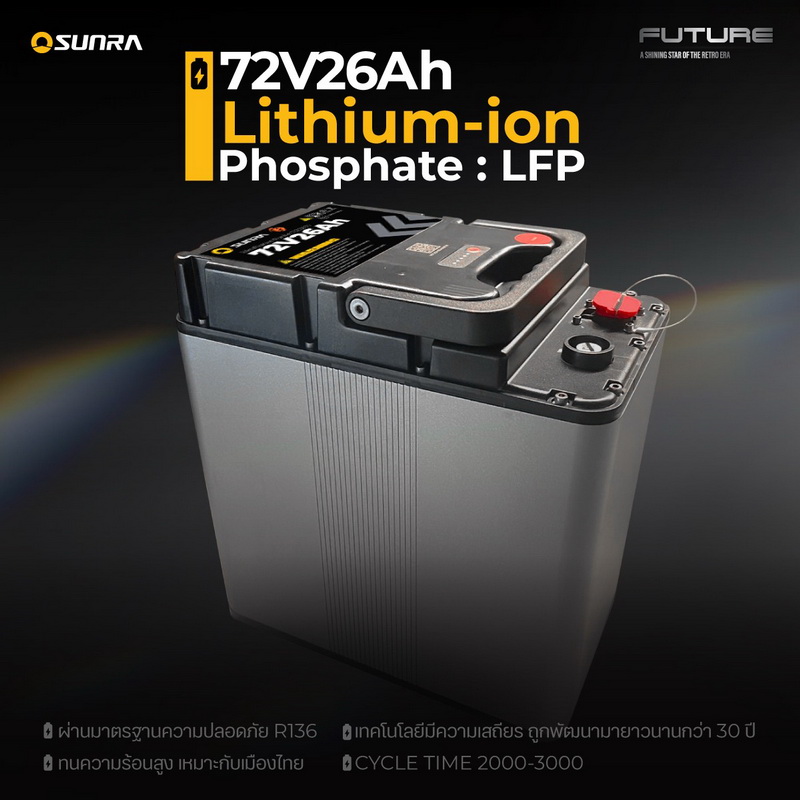 แบตเตอรี่ที่ติดตั้งมาเป็นแบตฯ LITHIUM-ION PHOSPHATE : LFP ขนาด 72V26Ah ใช้เวลาชาร์ท 2.5 ชม./ครั้ง ทำงานร่วมกับ HUB MOTOR ขนาด 12 นิ้ว แบบ DC Brushless