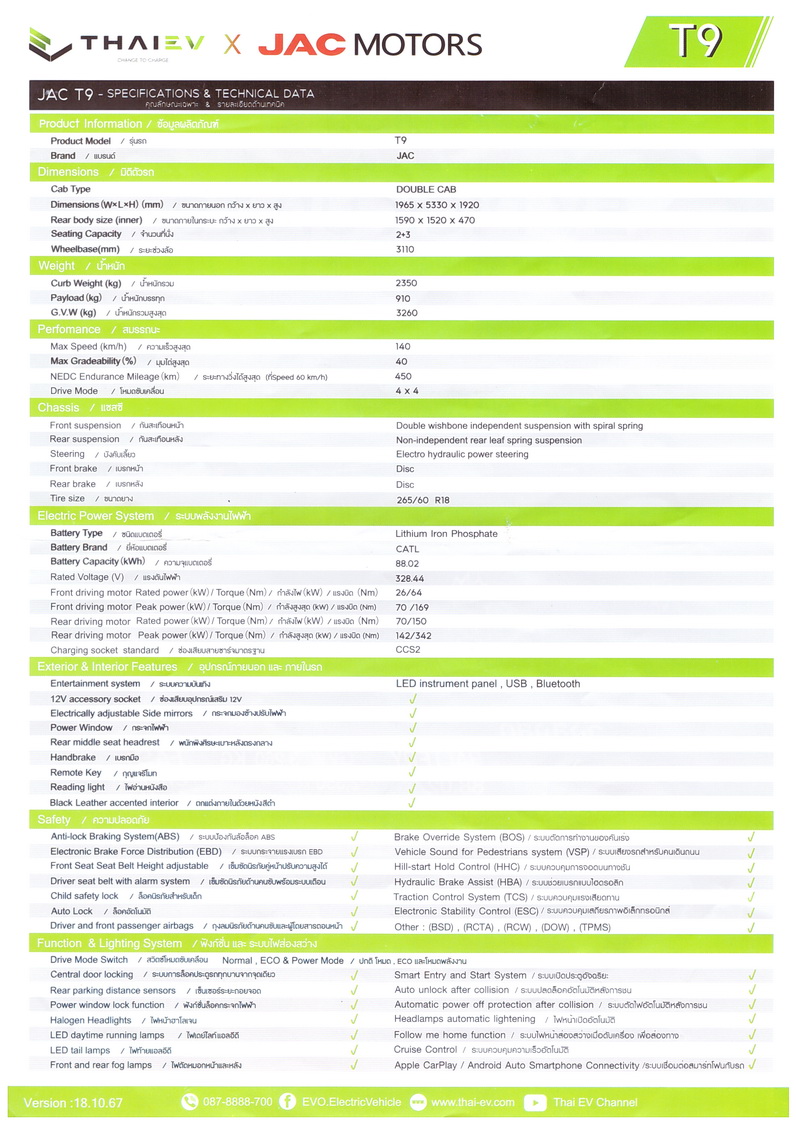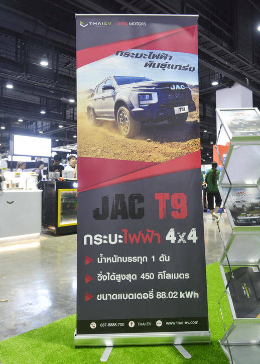 JAC รุ่น T9 เป็นรถกระบะไฟฟ้ารุ่นล่าสุดที่ THAI EV วางแผนเข้ามาทำตลาดในไทย หลังจากทำตลาดรุ่น T8 ไปก่อนหน้านี้ โดยนำมาโชว์ตัวในงาน EV EXPO 2024 ที่ศูนย์การประชุมแห่งชาติสิริกิติ์ วางแผนเปิดตัวอย่างเป็นทางการในงานมอเตอร์โชว์ 2025 คาดราคาอยู่ในระดับ 1.3-1.4 ล้านบาท แต่ถ้ากดราคาลงมาไม่เกินล้านน่าจะไปได้ดีพอสมควร