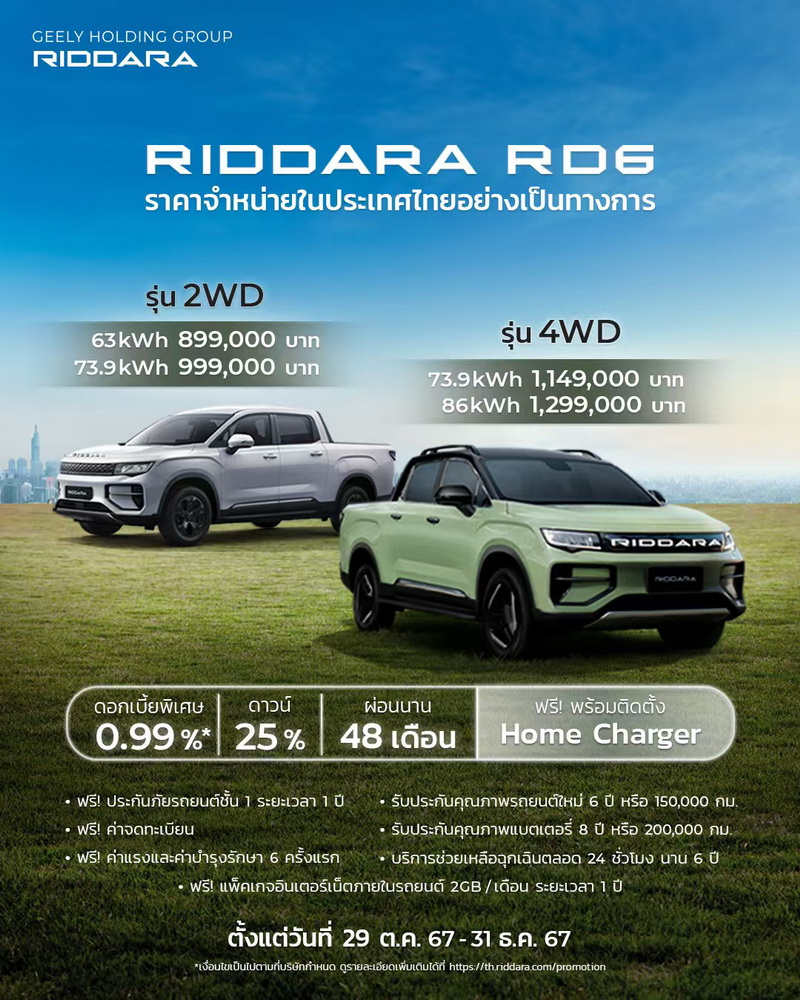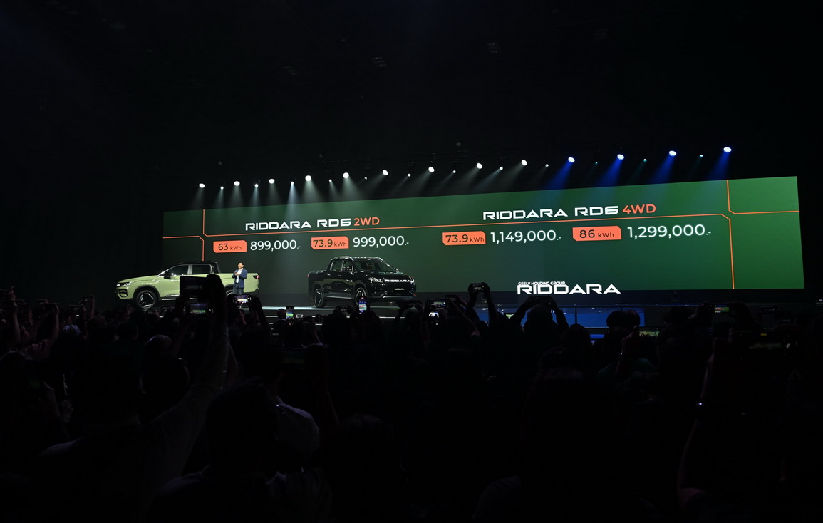 “ริดดารา” ประเทศไทย เปิดตัว RIDDARA RD6 รถกระบะไฟฟ้า 100% ในคอนเส็ปท์ DRIVE LIKE A SUV,FUNCTION LIKE A PICK UP” มาในดีไซน์หรูแบบรถ SUV แต่ฟังก์ชั่นการใช้งานไม่ต่างจากรถกระบะ ลุยสไตล์เอาท์ดอร์ได้ชิลๆ จัดเต็ม 4 รุ่นย่อย ทั้งระบบขับเคลื่อน 2 ล้อ และขับเคลื่อน 4 ล้อ แบตเตอรี่ความจุ 63kWh ถึง 86kWh เคาะราคาขายเริ่มต้น 899,000 บาทในรุ่นขับเคลื่อน 2 ล้อ ส่วนตัวท็อป RIDDARA RD6 4WD แบตเตอรี่ความจุ 86kWh ราคา 1,299,000 บาท