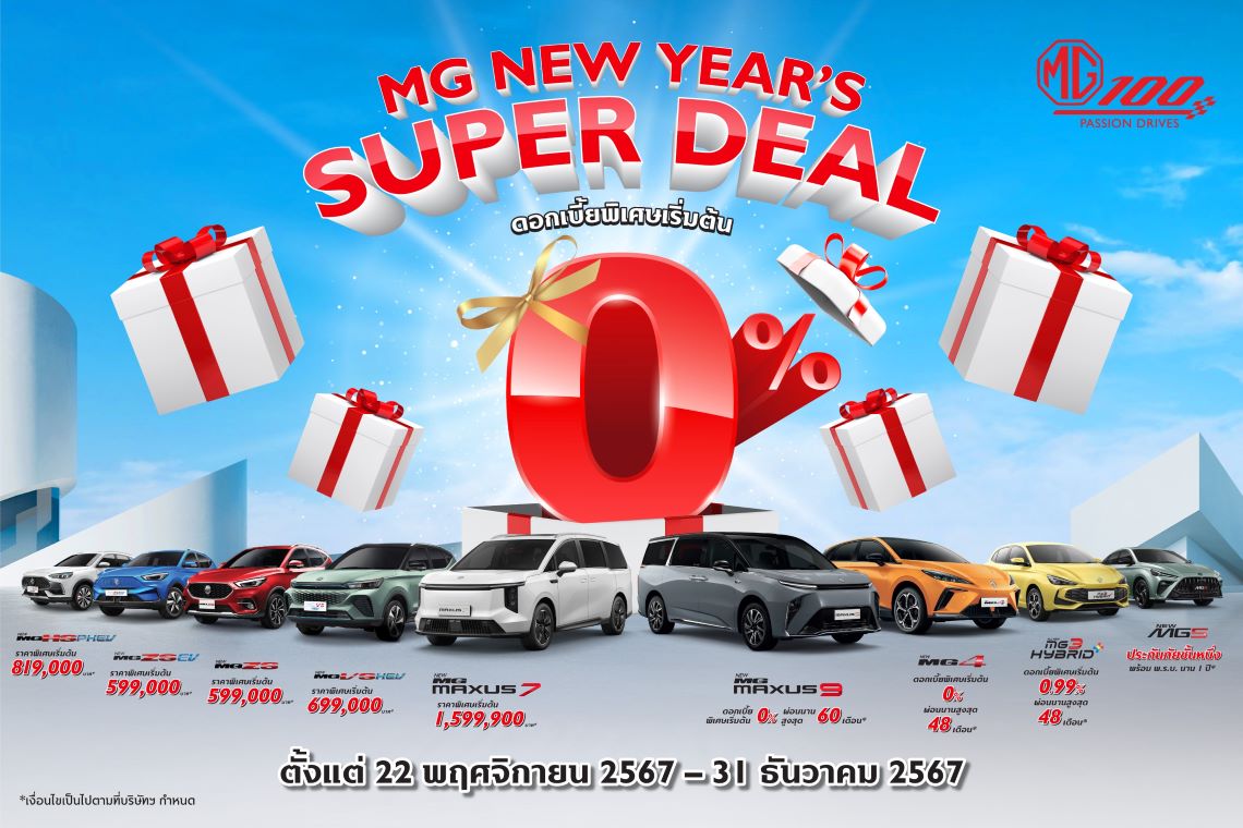 นอกจากนี้ เอ็มจี ยังได้สร้างสรรค์แคมเปญพิเศษ NEW YEAR’S SUPER DEAL เปิดโอกาสให้ผู้สนใจสามารถเป็นเจ้าของรถยนต์แบรนด์ เอ็มจี ได้ง่ายยิ่งขึ้น ด้วยหลากข้อเสนอสำหรับยนตรกรรมหลายรุ่น อาทิ ดอกเบี้ยเริ่มต้นพิเศษ 0% ผ่อนนานสูงสุด 5 ปี รวมถึงข้อเสนอช่วยผ่อนสูงสุด 5,000 บาท นานสูงสุด 20 เดือน ฯลฯ สำหรับลูกค้าที่จองตั้งแต่วันนี้ จนถึงวันที่ 31 ธันวาคม 2567