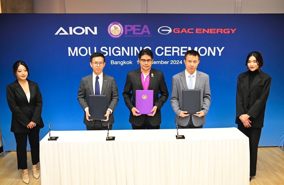 การไฟฟ้าส่วนภูมิภาค (PEA) บริษัท ไอออน ออโตโมบิล เซลล์ (ประเทศไทย) จำกัด (AION) และ บริษัท จีเอซี เอนเนอร์ยี่ เทคโนโลยี (ประเทศไทย) จำกัด (GAC ENERGY) ลงนามบันทึกข้อตกลงความร่วมมือ (MOU) เพื่อศึกษาระบบเชื่อมต่อและความเข้ากันได้ระหว่างเครื่องอัดประจุไฟฟ้า (EV Charger) ของ GAC Energy กับแพลตฟอร์ม PEA VOLTA Platform ที่ทันสมัย เพื่อพัฒนาโครงข่ายสถานีชาร์จรถยนต์ไฟฟ้าในประเทศไทยให้อำนวยความสะดวกให้ผู้ใช้งานยานยนต์ไฟฟ้าและนักลงทุนในธุรกิจสถานีชาร์จ