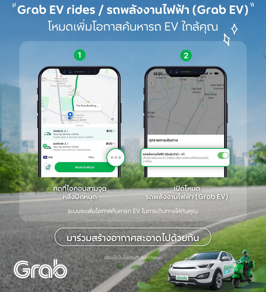 ในครั้งนั้น แกร็บ ประเทศไทย จัดงาน “Grab EV-LUTION เปลี่ยน…เพื่อสิ่งแวดล้อมและชีวิตที่ดีกว่า” ประกาศความร่วมมืออย่างเป็นทางการกับ 7 พันธมิตรชั้นนำ ได้แก่ Rever Automotive , Moove , Swap & Go , EV Station PluZ , H SEM Motor , STROM และ Auto Drive EV เดินหน้าโครงการ “Grab EV” เพื่อผลักดันเป้าหมายในการเพิ่มจำนวนการใช้ยานยนต์ไฟฟ้า (EV) โดยคาดว่าจะช่วยให้พาร์ทเนอร์คนขับสามารถเข้าถึง EV ได้ไม่ต่ำกว่า 8,000 คันภายในปี 2568 พร้อมชวนผู้ใช้บริการร่วมรักษ์โลกผ่านฟีเจอร์ ‘Grab EV rides’ ที่พัฒนาขึ้นเพื่อช่วยเพิ่มโอกาสค้นหารถ EV ในพื้นที่และช่วงเวลานั้นๆ มาให้บริการเป็นตัวเลือกแรก