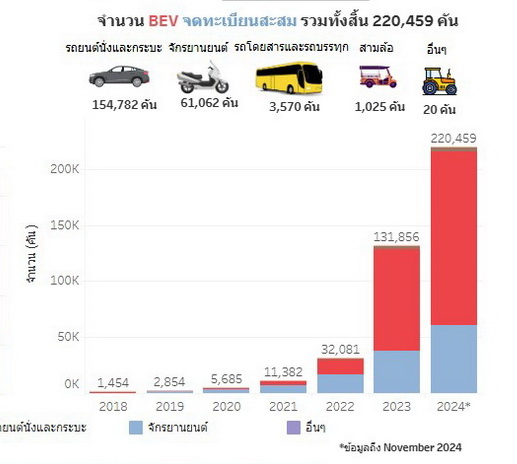 ยอดจดทะเบียนสะสมยานยนต์ไฟฟ้า 100% (BEV) พุ่ง 220,459 คัน เพิ่มขึ้นจากช่วงเวลาเดียวกันของปี 2566 ถึง 82.61% เป็นรถยนต์นั่งไฟฟ้า 151,092 คัน รถตุ๊กตุ๊กไฟฟ้า 1,025 คัน รถบัสไฟฟ้า 2,713 คัน ส่วนมอเตอร์ไซค์ไฟฟ้ามี 61,062 คัน ส่วนยอดจดทะเบียนสะสม 11 เดือน (มกราคม - พฤศจิกายน 2567) มียานยนต์ไฟฟ้าประเภท BEV จดทะเบียนใหม่สะสม 89,658 คัน เพิ่มขึ้นจากเดือนมกราคม - พฤศจิกายนปีที่แล้ว 0.94%
