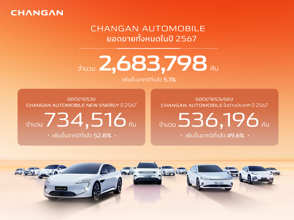 ฉงชิ่ง, 10 มกราคม 2568 – CHANGAN Automobile ประกาศความสำเร็จครั้งสำคัญในโอกาสครบรอบ 40 ปี กับยอดขายรถยนต์ทั่วโลกในปี 2567 สูงสุดเป็นประวัติการณ์ถึง 2.683 ล้านคัน เพิ่มขึ้น 5.1% เมื่อเทียบกับปีก่อนหน้าและเป็นยอดขายสูงสุดในรอบ 7 ปี สานต่อกลยุทธ์ "ความก้าวหน้าและการขยายตัวอย่างมั่นคง" (Steady Progress and Expansion) ในตลาดที่มีการแข่งขันสูง สะท้อนถึงความสำเร็จในการดำเนินงานอันแข็งแกร่งของ CHANGAN ด้วย 3 กลยุทธ์หลัก 3 แบรนด์หลัก และ 3 สายการผลิตหลัก การันตีด้วยยอดขายที่เติบโตในกลุ่มธุรกิจหลัก ทั้งในส่วนของแบรนด์รถยนต์ที่มียอดขาย 2.23 ล้านคัน ยอดขายรถยนต์พลังงานใหม่ (NEV) เพิ่มขึ้น 52.8% เป็น 734,516 คัน และยอดขายในต่างประเทศเพิ่มขึ้นอย่างก้าวกระโดดถึง 49.6% เป็น 536,196 คัน ตอกย้ำความสำเร็จในการก้าวเป็นผู้นำยนตรกรรมปล่อยคาร์บอนต่ำ และเป็นมิตรกับสิ่งแวดล้อม