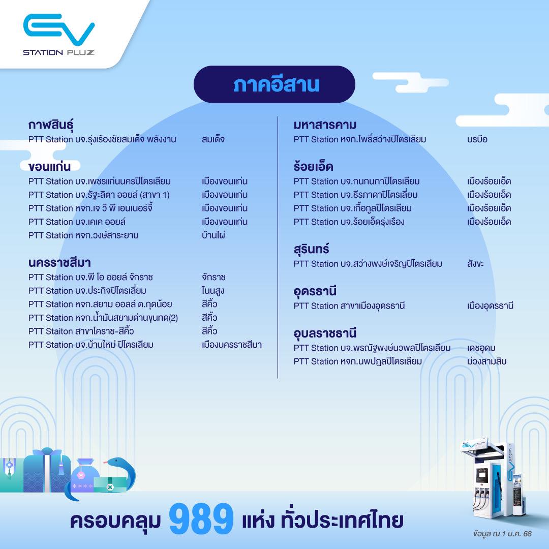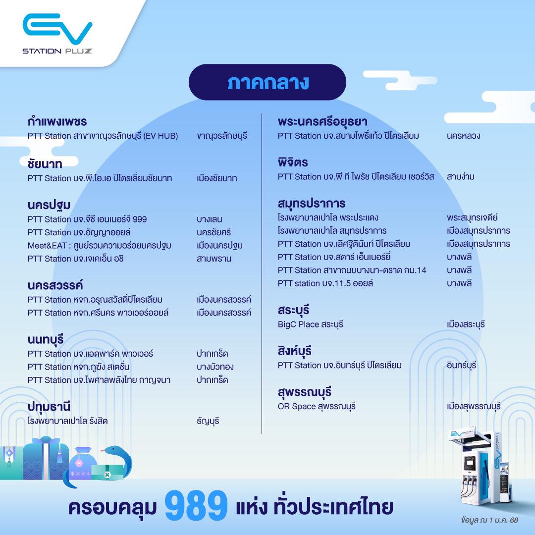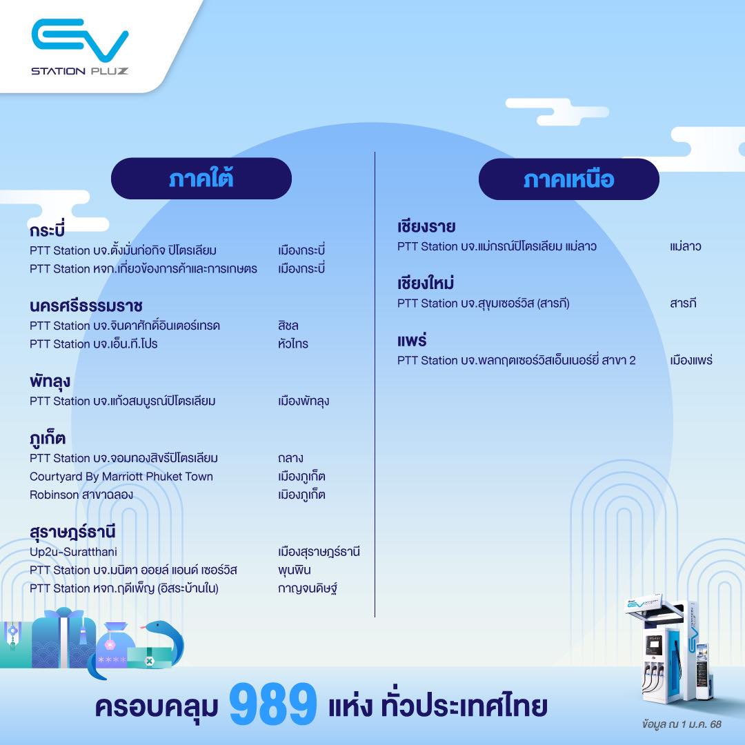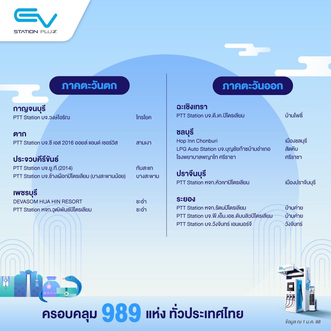 EV Station PluZ อัพเดตจุดชาร์จใหม่เพิ่มอีก 81 แห่ง รวมเปิดแล้ว 989 สาขา ทั่วประเทศ (ข้อมูล ณ 1 ม.ค. 2568) โดยมี EV HUB ที่รองรับการชาร์จพร้อมกัน 8 หัวชาร์จ ด้วยเครื่องชาร์จ DC FASTCHARGE กำลังไฟฟ้าสูง 180 กิโลวัตต์ เปิดให้บริการอย่างเป็นทางการ 5 สถานี ล่าสุดเปิดที่ PTT Station สาขาแยกหาดจอมเทียน จ.ชลบุรี เปิดให้บริการ 24 ชม.