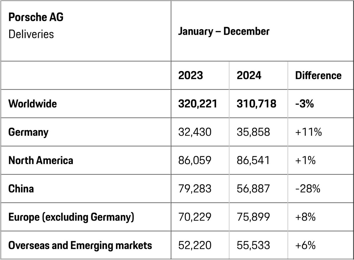 ในปี 2024 Porsche AG ทำการเปลี่ยนแปลงรถยนต์ 4 รุ่นจากทั้งหมด 6 รุ่น ได้แก่ Panamera, Taycan, 911 และ Macan ส่งผลให้ปอร์เช่มียอดขายเติบโตในสี่ในห้าภูมิภาคทั่วโลก ในยุโรป (ไม่รวมเยอรมนี) ปอร์เช่ส่งมอบรถยนต์ได้ 75,899 คัน เพิ่มขึ้น 8% ในตลาดบ้านเกิดอย่างเยอรมนี ส่งมอบ 35,858 คัน เพิ่มขึ้น 11% อเมริกาเหนือเป็นภูมิภาคการขายที่ใหญ่ที่สุด มีการส่งมอบ 86,541 คัน เพิ่มขึ้น 1% ในประเทศจีนมีการส่งมอบรถยนต์ให้กับลูกค้า 56,887 คัน ลดลง -28% สาเหตุหลักมาจากสถานการณ์ทางเศรษฐกิจที่ท้าทายอย่างต่อเนื่องในภูมิภาคนี้ แต่ในตลาดเกิดใหม่มีการพัฒนาเชิงบวก มีการส่งมอบรถยนต์จำนวน 55,533 คัน เติบโต 6%