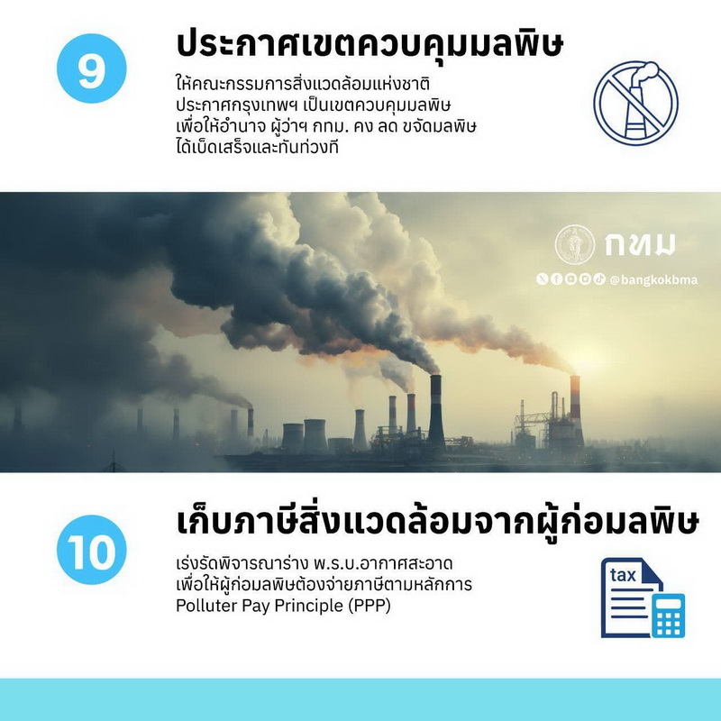 9.ประกาศเขตควบคุมมลพิษ ให้คณะกรรมการสิ่งแวดล้อมแห่งชาติประกาศกรุงเทพฯ เป็นเขตควบคุมมลพิษเพื่อให้อำนาจผู้ว่าฯ กทม. คง ลด ขจัดมลพิษได้เบ็ดเสร็จและทันท่วงที