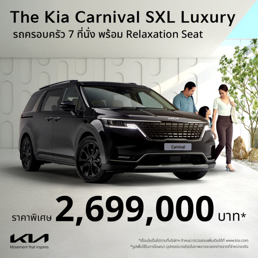 โปรโมชันสำหรับลูกค้า The Kia Carnival SXL Luxury (7 ที่นั่ง) ราคาพิเศษ 2,699,000 บาท (ราคาจำหน่ายปกติ 2,990,000 บาท หักส่วนลดมูลค่า 291,000 บาท)