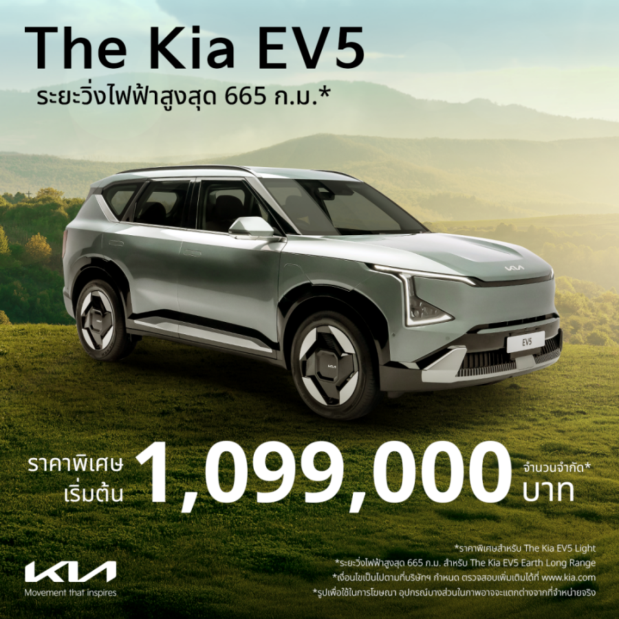 เกีย เซลส์ ประเทศไทย มอบข้อเสนอราคาพิเศษ ครอบคลุมยนตรกรรม SUV และ MPV ไฟฟ้าและเครื่องสันดาป 4 รุ่นหลัก มาพร้อมแพ็กเกจคุ้มครองสุดพิเศษ มีไฮไลต์ คือ The Kia EV5 Light ปกติราคา 1,299,000 บาท ลดราคา 200,000 เหลือเพียง 1,099,000 บาท มีจำนวนจำกัด และ The Kia EV5 Air มอบส่วนลดพิเศษมูลค่า 170,000 บาท สำหรับลูกค้าที่มองหารถไฟฟ้าที่ตอบโจทย์ไลฟ์สไตล์คนยุคใหม่ครบจบด้วยความอเนกประสงค์ ต่อด้วยข้อเสนอสำหรับรถพรีเมียม SUV 3 แถว 6-7 ที่นั่งอย่าง The Kia Sorento Premium HEV ราคาปกติ 1,959,000 ลดราคา 260,000 เหลือเพียง 1,699,000 บาท และ The Kia Sorento Premium Plus PHEV ราคาปกติ 2,099,000 บาท ลด 200,000 เหลือเพียง 1,899,000 โดยยนตรกรรมกลุ่มพลังงานไฟฟ้าจะมาพร้อมแพ็กเกจ 7-7-8 ประกอบด้วย การรับประกันคุณภาพนาน 7 ปี บริการช่วยเหลือฉุกเฉิน ฟรี 24 ชั่วโมง 7 ปี ไม่จำกัดระยะทาง การรับประกันแบตเตอรี่รถยนต์ (High-Voltage Battery) นาน 8 ปี