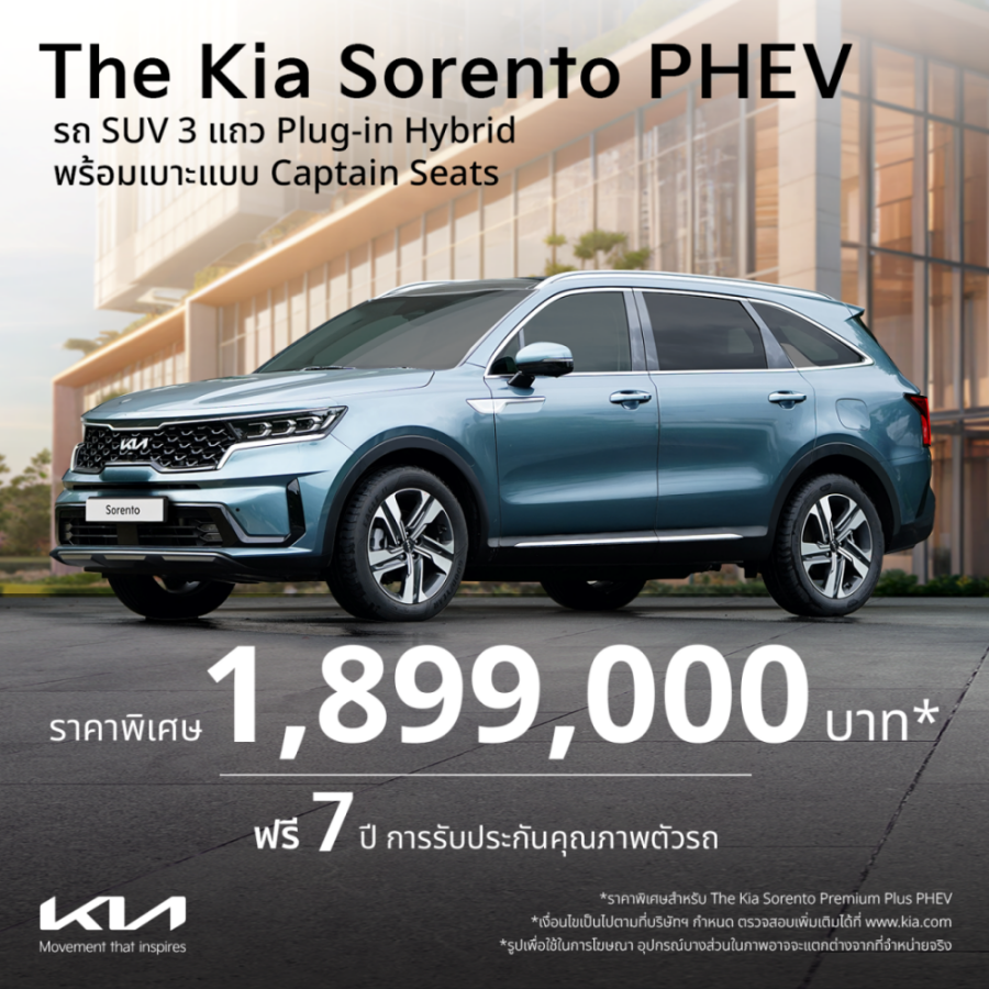 โปรโมชันสำหรับลูกค้า The Kia Sorento Premium Plus PHEVราคาพิเศษ 1,899,000 บาท (ราคาจำหน่ายปกติ 2,099,000 บาท หักส่วนลดมูลค่า 200,000 บาท) – ไม่มี Kia Home Chargero อัตราดอกเบี้ยพิเศษ (ต้นงวด) 1.99% พร้อมดาวน์ 25% สำหรับระยะเวลาผ่อนชำระ 48 เดือน