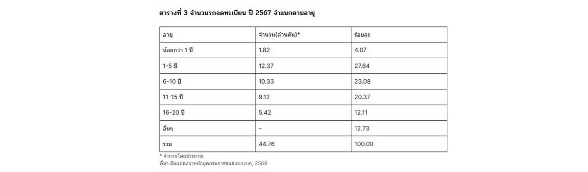 โดยข้อมูลของกรมขนส่งทางบกเมื่อสิ้นปีงบประมาณ 2562 มีรถจดทะเบียนใหม่ในปี 2562 จำนวน 3.10 ล้านคัน และเมื่อผ่านช่วงระบาดของ COVID-19 ปีงบประมาณ 2566 กลับพบว่าจำนวนรถจดทะเบียนใหม่ยังไม่ฟื้นตัวเหลือ 3.08 ล้านคัน หรือลดลงเฉลี่ยต่อปีร้อยละ 0.2 โดยจำนวนรถใหม่ที่จดทะเบียนมีแนวโน้มลดลงอย่างต่อเนื่องในช่วงปีงบประมาณ 2566 ถึง 2567 ซึ่งลดลงถึงร้อยละ 13.16 หรือเหลือ 2.67 ล้านคัน