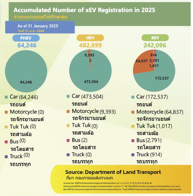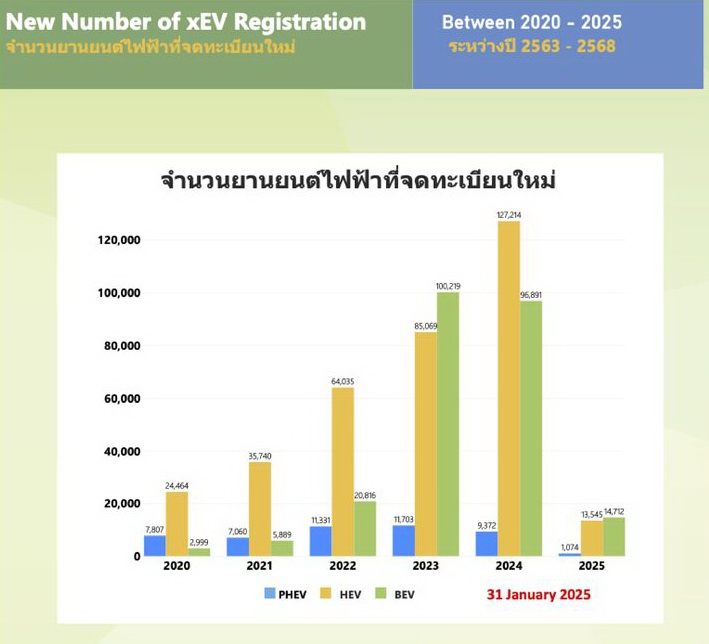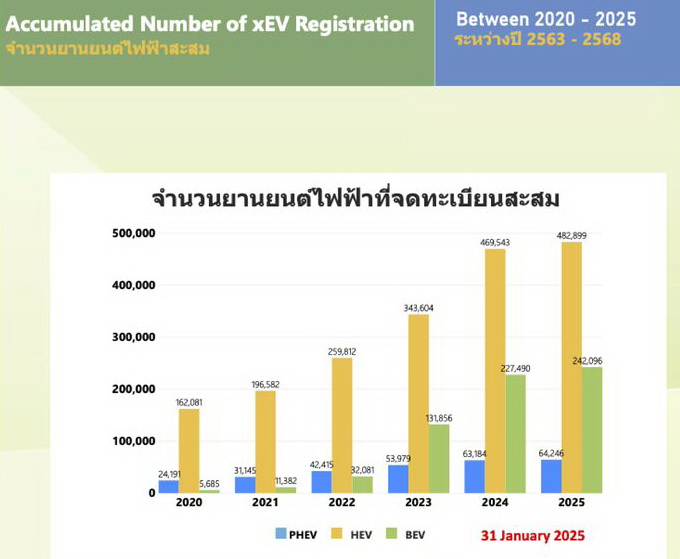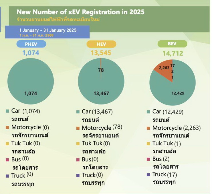 สมาคมยานยนต์ไฟฟ้าไทยอัพเดตสถานการณ์ยานยนต์ไฟฟ้าของประเทศไทยล่าสุดว่า ณ วันที่ 31 มกราคม 2568 ยอดจดทะเบียนใหม่รถยนต์ BEV ระหว่างวันที่ 1 - 31 มกราคม 2568 มี 12,429 คัน ดันยอดจดทะเบียนสะสมรถยนต์ BEV ในไทยเพิ่มเป็น 172,537 คัน ส่วน HEV มียอดจดทะเบียนใหม่ 13,467 คัน เพิ่มยอดจดทะเบียนสะสมเป็น 473,504 คัน รถยนต์ PHEV มียอดจดทะเบียนใหม่ 1,074 คัน ยอดจดทะเบียนสะสม 64,246 คัน สถานีอัดประจุไฟฟ้ามีประมาณ 3,429 แห่ง