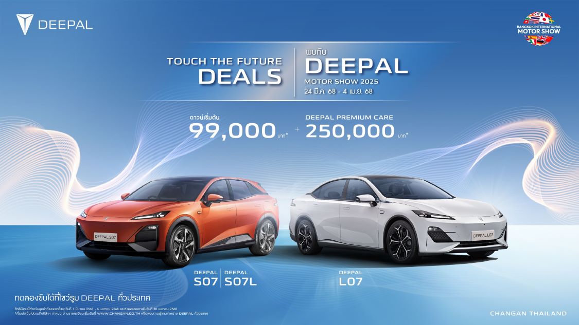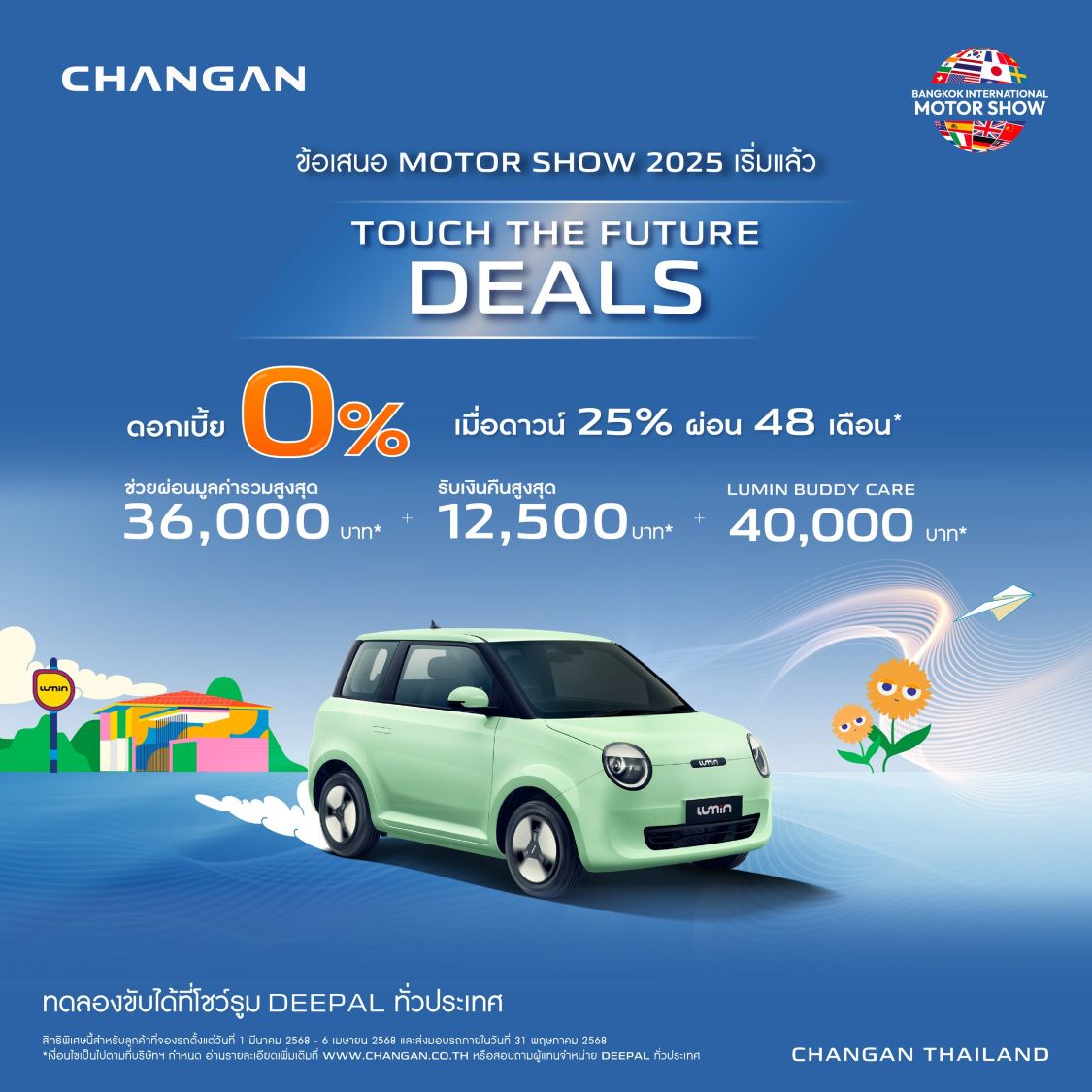CHANGAN AUTO จัดเต็มแคมเปญ “Touch the future deals ” อุ่นเครื่องรับ MOTOR SHOW 2025สำหรับผู้จองรถยนต์ไฟฟ้าDEEPAL รุ่น S07, S07 L และ L07 , Deepal E07 และ LUMIN ตั้งแต่วันที่ 1 มีนาคม 2568 – 6 เมษายน 2568 และรับรถยนต์ภายในวันที่ 30 เมษายน 2568 เท่านั้น!