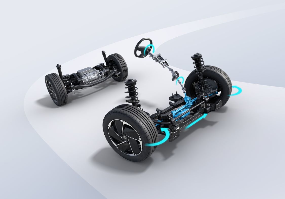 รถยนต์ไฟฟ้ารุ่นนี้ ได้รับการออกแบบให้มีการกระจายน้ำหนักแบบสมมาตร 50:50 ระหว่างล้อหน้าและล้อหลัง ผสานกับการวางตำแหน่งแบตเตอรี่ที่ช่วยลดจุดศูนย์ถ่วงของตัวรถให้ต่ำลง (Low Centre of Gravity) ส่งผลให้การยึดเกาะถนนเป็นไปอย่างยอดเยี่ยม เพิ่มเสถียรภาพขณะเข้าโค้งและการเร่งแซง ลดอาการโคลงตัวเมื่อต้องเผชิญกับสภาพถนนที่ท้าทาย เสริมความสมบูรณ์แบบของระบบขับเคลื่อนด้วยระบบช่วงล่างอิสระแบบแมคเฟอร์สันสตรัทด้านหน้า และ 5-Link Suspension ด้านหลังที่ปรับจูนมาเป็นพิเศษ เพื่อเพิ่มการเกาะถนน รองรับ การเข้าโค้งได้อย่างเฉียบคมและมั่นคง แม้ในความเร็วสูง ช่วยลดแรงสั่นสะเทือนระหว่างการขับขี่ ให้สมดุลระหว่างความนุ่มนวลและสมรรถนะสูงสุด