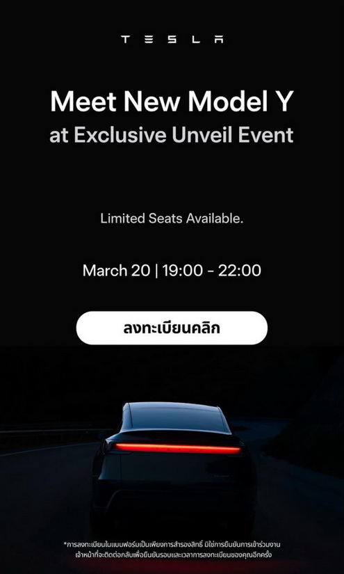 Tesla Thailand อัปเดตการจัดอีเว้นท์ Experience New Model Y at Exclusive Unveil Event เพื่อเปิดตัว Model Y โฉมใหม่ในไทยแบบเอ็กซ์คลูซีฟ ที่ Unformat Studio ซ.สุคนธสวัสดิ์ กรุงเทพ ในวันที่ 20 มี.ค. 2568 เวลา 19.00 - 22.00 น.