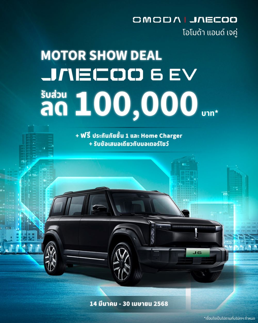OMODA & JAECOO (โอโมด้า แอนด์ เจคู่) มอบข้อเสนอสุดพิเศษสำหรับรถพลังงานไฟฟ้าแบบออฟโรด JAECOO 6 EV ทั้งรุ่น Long Range 4WD และ Long Range 2WD ด้วยส่วนลด 100,000 บาท ที่มาพร้อมข้อเสนอเดียวกับงานมอเตอร์โชว์แบบจัดเต็มทั้ง ประกันภัยชั้น 1 , Home Charger , บริการช่วยเหลือฉุกเฉิน , สายต่อพ่วงอุปกรณ์ไฟฟ้า (V-to-L) ฯลฯ สำหรับผู้จองรถในระหว่างวันที่ 14 มีนาคม – 30 เมษายน 2568 นี้เท่านั้น