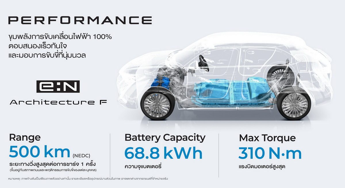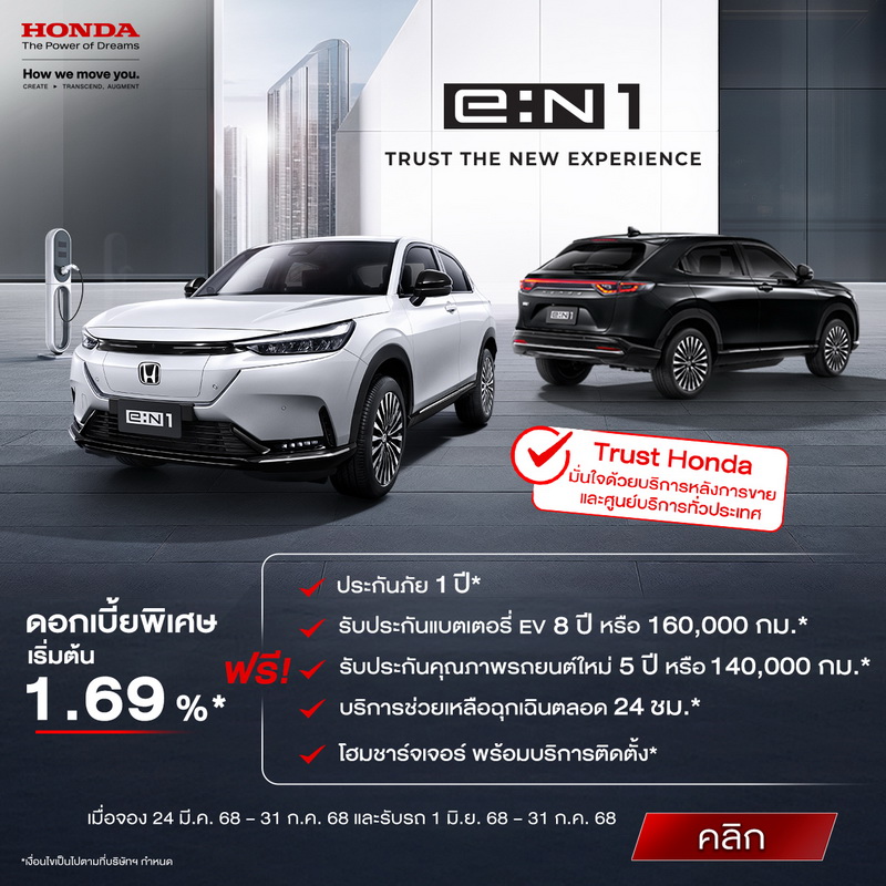 ฮอนด้า ประเทศไทย เปิดขาย Honda e:N1 ขุมพลังไฟฟ้า 100% รุ่นแรกของฮอนด้าในประเทศไทยอย่างเป็นทางการ เพื่อเสริมความแข็งแกร่งให้กับไลน์อัปยนตรกรรม xEV มาพร้อมขุมพลังไฟฟ้าแรงบิดสูงสุด 310 นิวตัน-เมตร วิ่งได้ระยะทาง 500 กม./ชาร์จ เคาะราคา 1,199,000 บาทสำหรับสีดำคริสตัล (มุก) ส่วนสีขาวแพลทินัม (มุก) ราคา 1,203,000 บาท รับประกันแบตเตอรี่ EV และระบบขับเคลื่อนไฟฟ้าทั้งระบบ 8 ปี หรือ 160,000 กม.