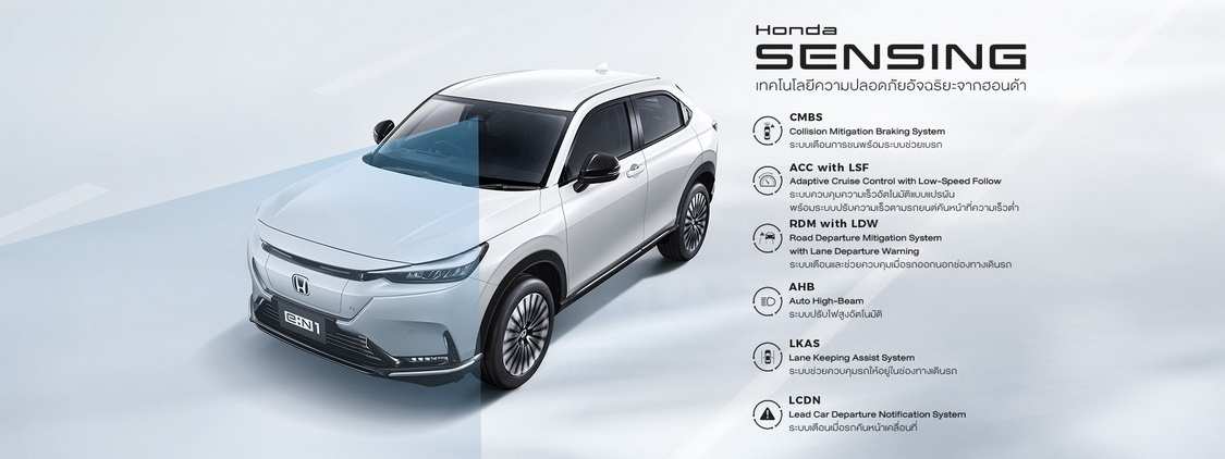 Honda e:N1 มาพร้อมเทคโนโลยีความปลอดภัยอัจฉริยะ ฮอนด้า เซนส์ซิ่ง (Honda SENSING) ที่ทำงานร่วมกับกล้องมุมกว้างด้านหน้า ช่วยตรวจจับรถยนต์และคนเดินถนนได้อย่างมีประสิทธิภาพ โดยมีฟังก์ชันการทำงานหลัก ๆ ดังนี้