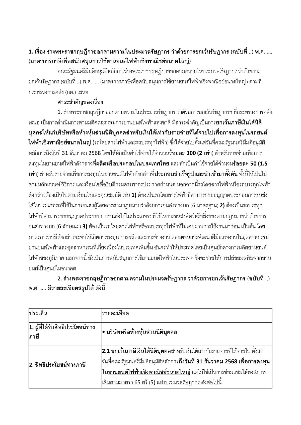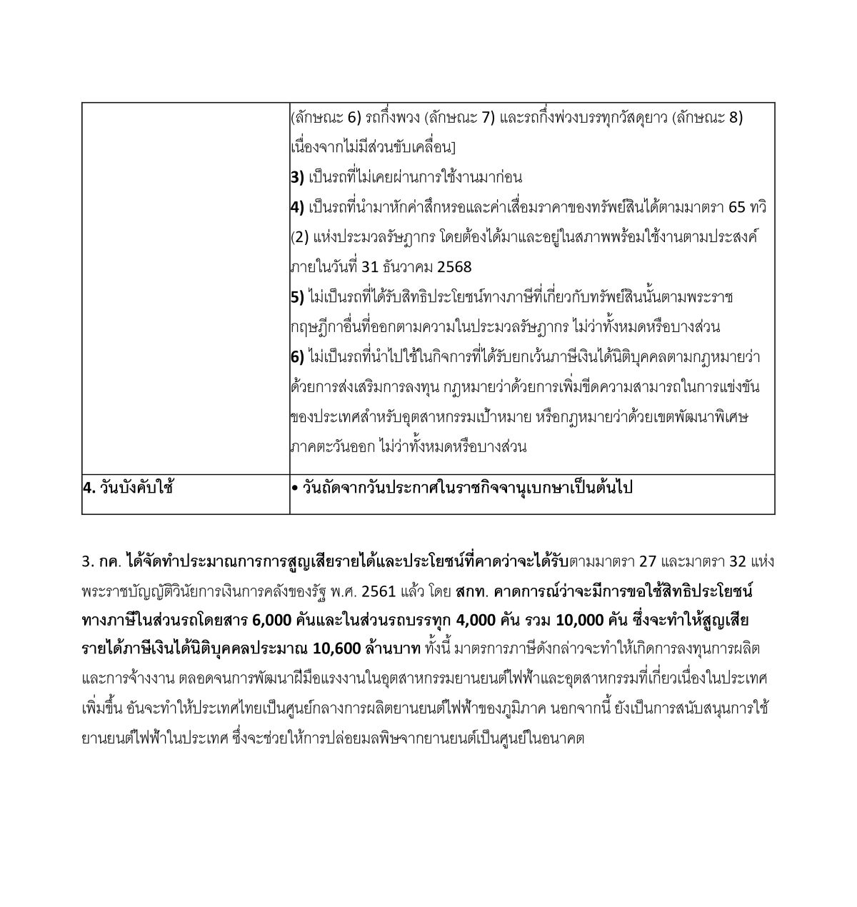 ร่าง พ.ร.ฎ. มีสาระสำคัญเป็นการยกเว้นภาษีเงินได้นิติบุคคล ให้แก่บริษัท หรือห้างหุ้นส่วนนิติบุคคล สำหรับเงินได้เท่ากับรายจ่ายเพื่อการลงทุนในยานยนต์ไฟฟ้าเชิงพาณิชย์ขนาดใหญ่ (รถโดยสารไฟฟ้า และรถบรรทุกไฟฟ้า) ที่ได้จ่ายไปตั้งแต่วันที่ ครม. มีมติอนุมัติหลักการ จนถึงวันที่ 31 ธ.ค.68 โดยสามารถนำไปหักเป็นค่าใช้จ่ายได้ 2 เท่า สำหรับรายจ่ายเพื่อการลงทุนในยานยนต์ไฟฟ้าเชิงพาณิชย์ขนาดใหญ่ ที่ผลิตหรือประกอบในประเทศไทย หรือให้หักเป็นค่าใช้จ่ายได้ 1.5 เท่า สำหรับรายจ่ายเพื่อการลงทุนในยานยนต์ไฟฟ้าเชิงพาณิชย์ขนาดใหญ่ ที่ประกอบสำเร็จรูปและนำเข้ามาทั้งคัน