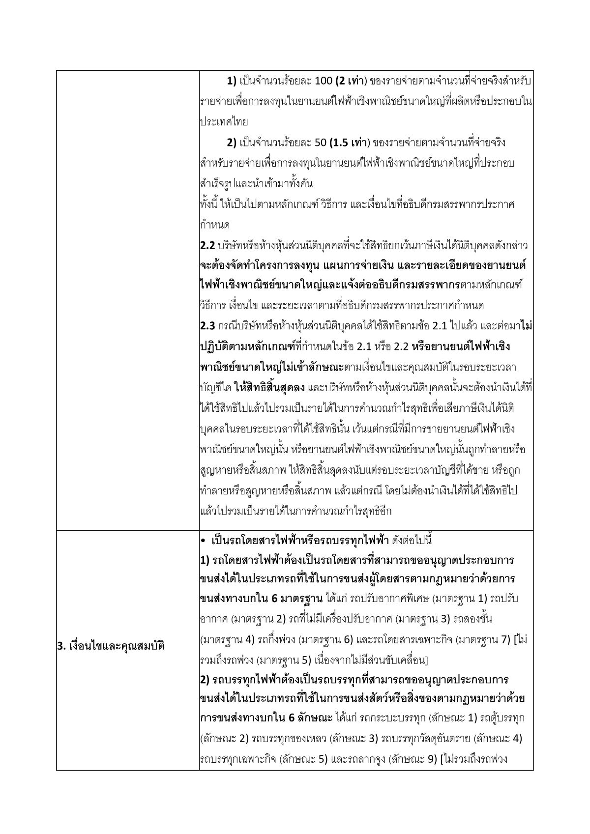2.รถบรรทุกไฟฟ้า ต้องเป็นรถบรรทุกที่สามารถขออนุญาตประกอบการขนส่งได้ ในประเภทรถที่ใช้ในการขนส่งสัตว์ หรือสิ่งของ ตามกฎหมายว่าด้วยการขนส่งทางบกใน 6 ลักษณะ ได้แก่ รถกระบะบรรทุก (ลักษณะ 1) รถตู้บรรทุก (ลักษณะ 2) รถบรรทุกของเหลว (ลักษณะ 3) รถบรรทุกวัสดุอันตราย (ลักษณะ 4) รถบรรทุกเฉพาะกิจ (ลักษณะ 5) และรถลากจูง (ลักษณะ 9) [ไม่รวมถึงรถพ่วง (ลักษณะ 6) รถกึ่งพวง (ลักษณะ 7) และรถกึ่งพ่วงบรรทุกวัสดุยาว (ลักษณะ 8) เนื่องจากไม่มีส่วนขับเคลื่อน]